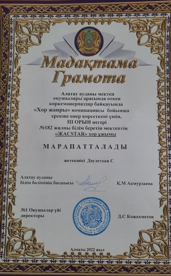 Алатау ауданы мектеп оқушылары арасында өткен көркемөнерпаздар байқауында "Аспапта ойнау" жанры бойынша мектебіміздің "Алатау" дуэті ІІ орынға, жетекшісі Қонысбеков Қ., "Хор жанры" бойынша "Жасstar" хор ұжымы ІІІ орынға ие болды. Жетекшісі Дәулетхан С. Құттықтаймыз!