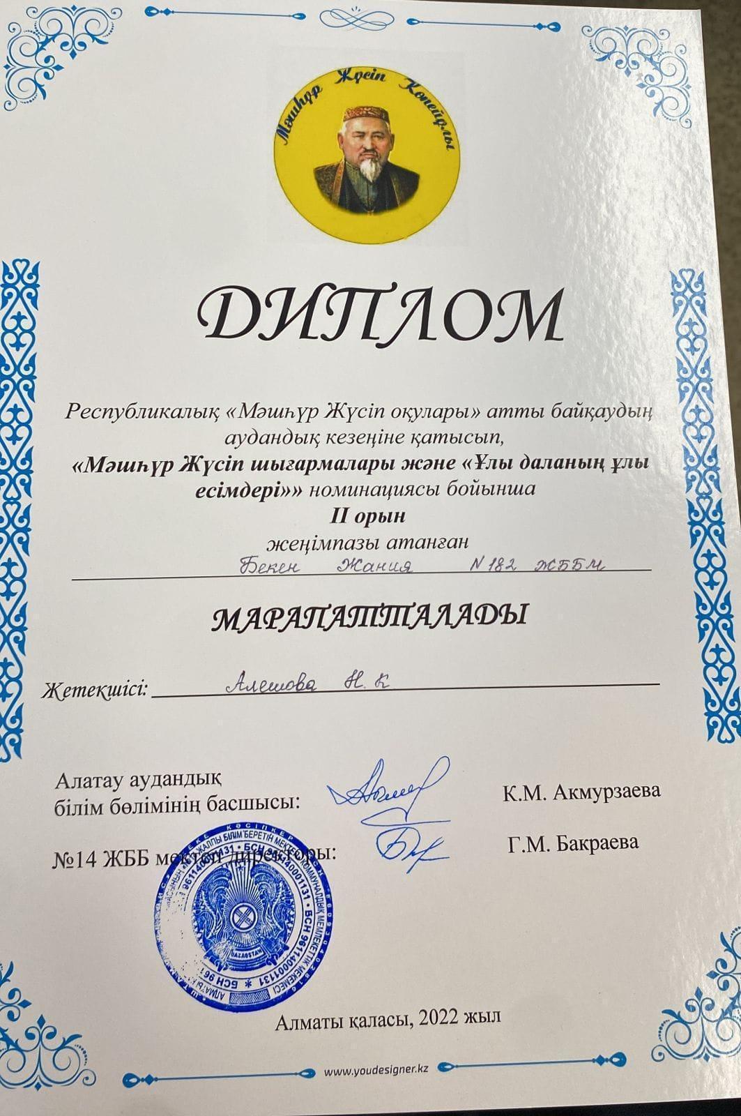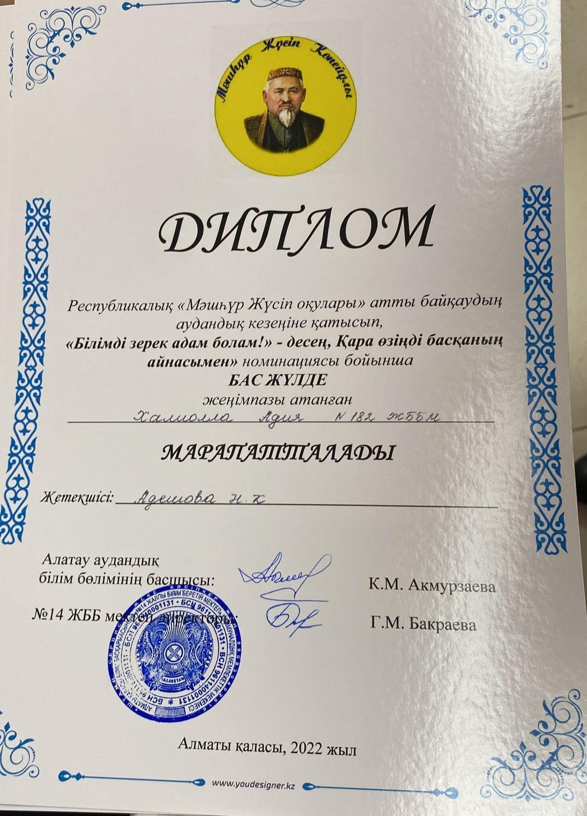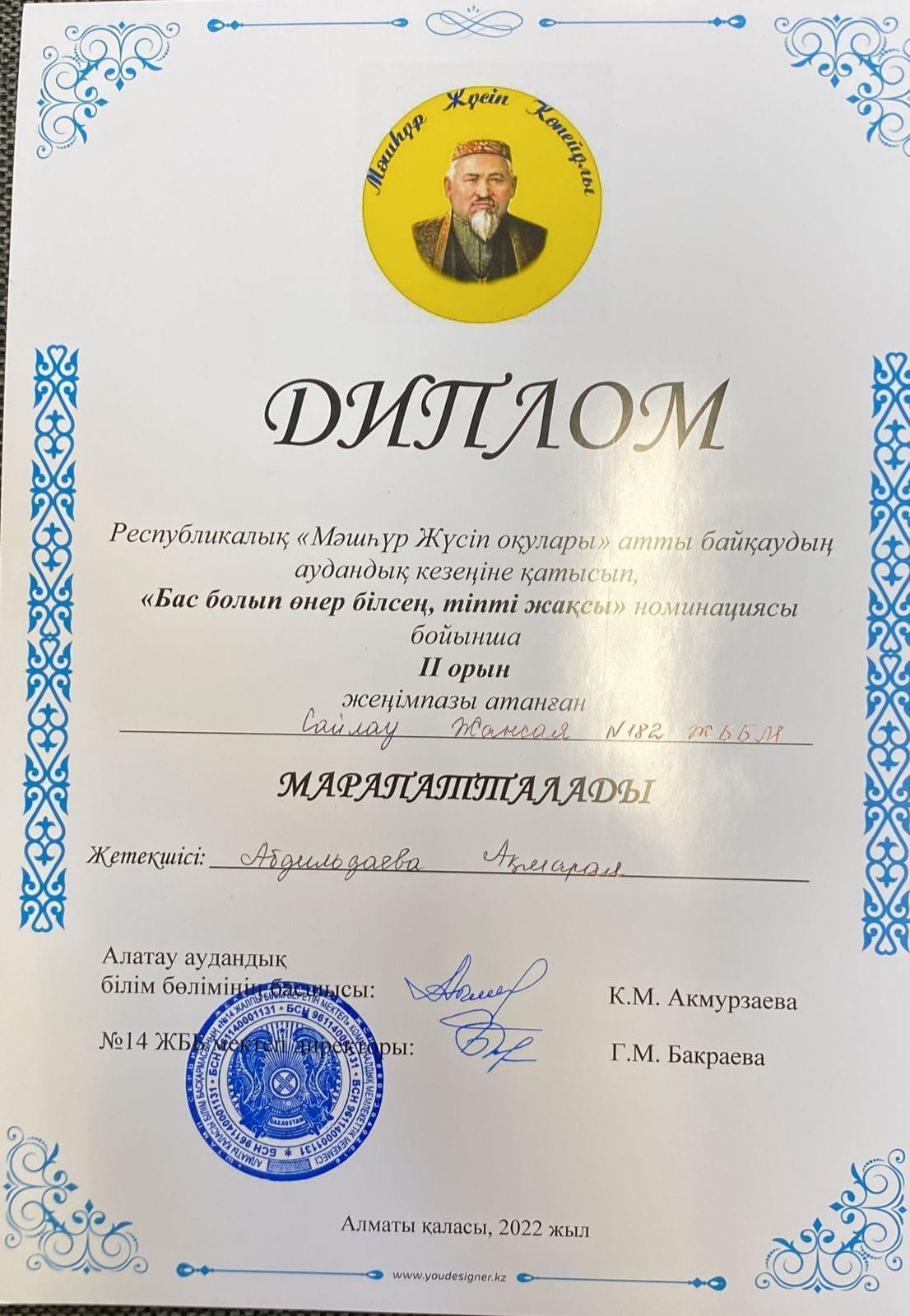 Республикалық "Мәшһүр Жүсіп оқулары" атты байқаудың аудандық кезеңіне қатысып, "Білімді зерек адам болам!"-десең, Қара сөзіңді басқаның айнасымен" номинациясы бойынша мектебіміз оқушылары Халиолла Адия Бас жүлдеге, "Мәшһүр Жүсіп шығармалары" және "Ұлы даланың ұлы есімдері" номинациясы бойынша Бекен Жания ІІ орынға, "Бас болып өнер білсең, тіпті жақсы" номинациясы бойынша Сайлау Жансая ІІ орынға ие болды. Жетекшісі Адешова Н.Қ. Құттықтаймыз!