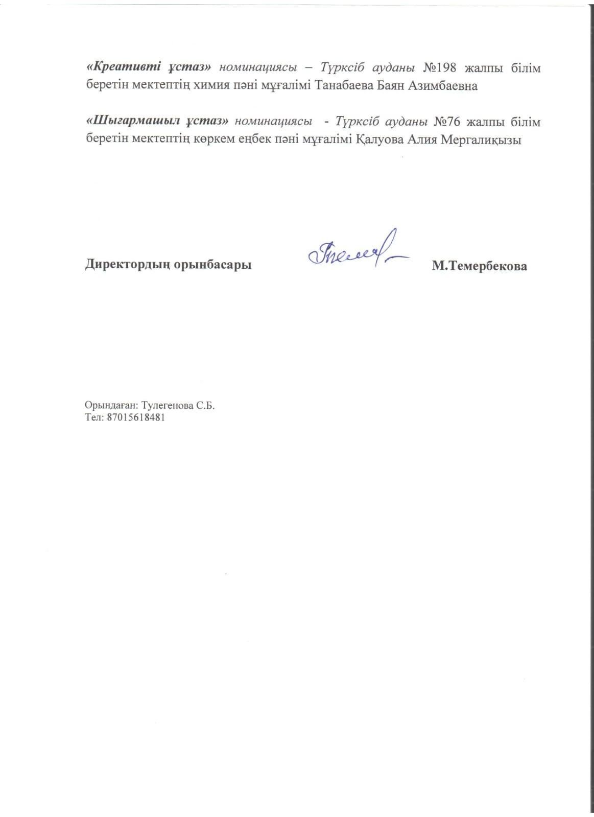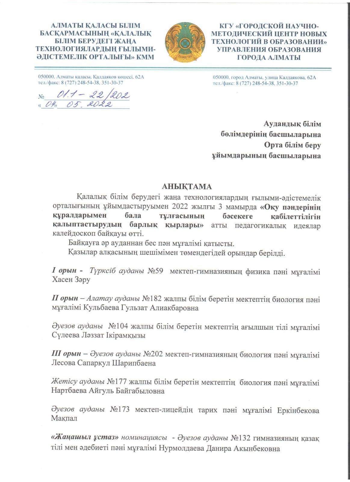 Мектебіміздің биология пәні мұғалімі, педагог зерттеуші Кульбаева Гульзат Алиакбаровна «Оқу пәндерінің құралдарымен бала тұлғасының бәсекеге қабілеттілігін қалыптастырудың барлық қырлары» атты қалалық педагогикалық идеялар калейдоскоп байқауына "Биология сабақтарында виртуалды зертхананың бала тұлғасының бәсекеге қабілеттілігін қалыптастырудағы тиімділігі" тақырыбындағы зерттеу жұмысымен қатысып, жүлделі ІІ орынға ие болды. Құттықтаймыз! Шығармашылық табыстар тілейміз!