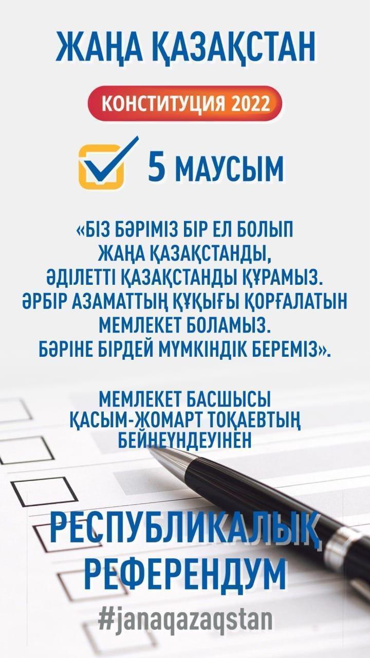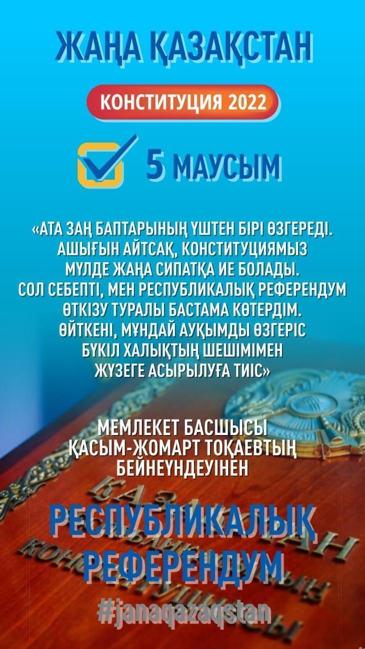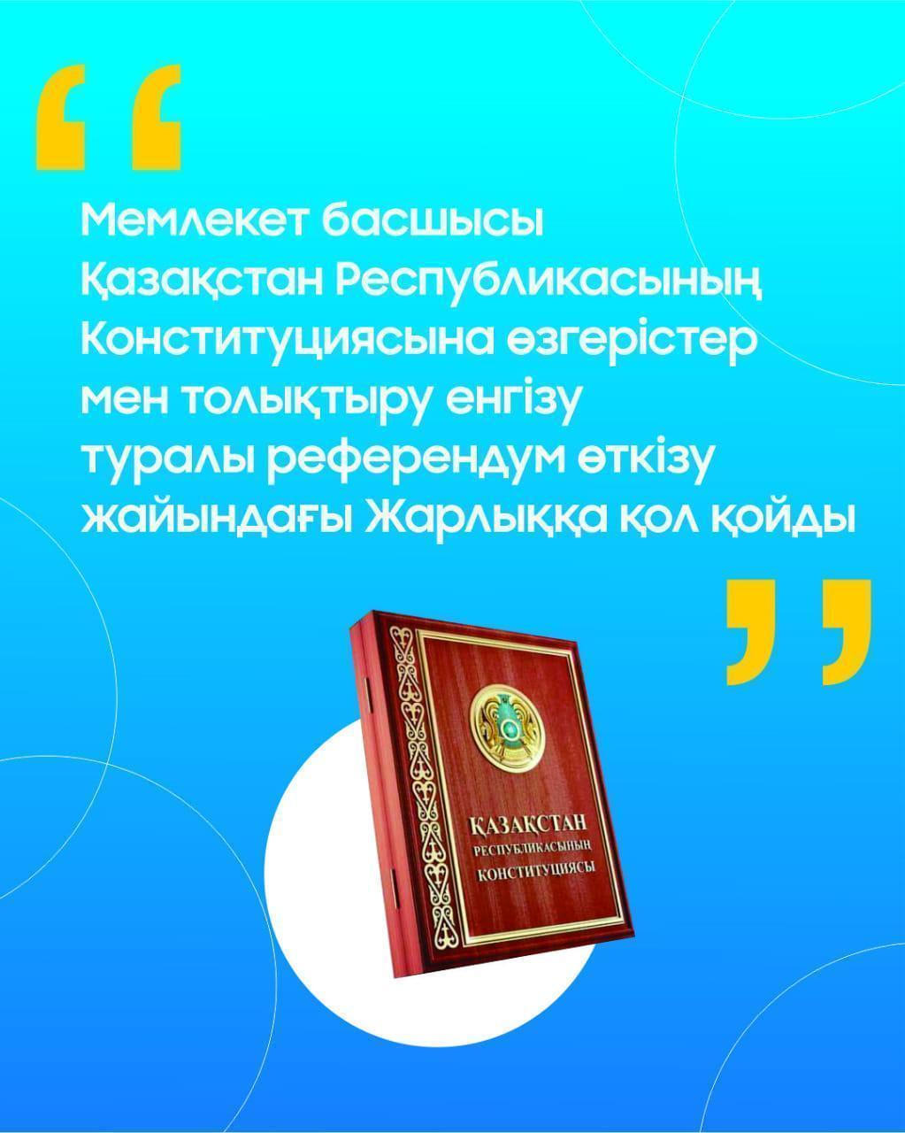Мемлекет басшысы 5 маусымда Қазақстан Республикасының Конституциясына өзгерістер мен толықтыру енгізу туралы референдум өткізу жайындағы Жарлыққа қол қойды.