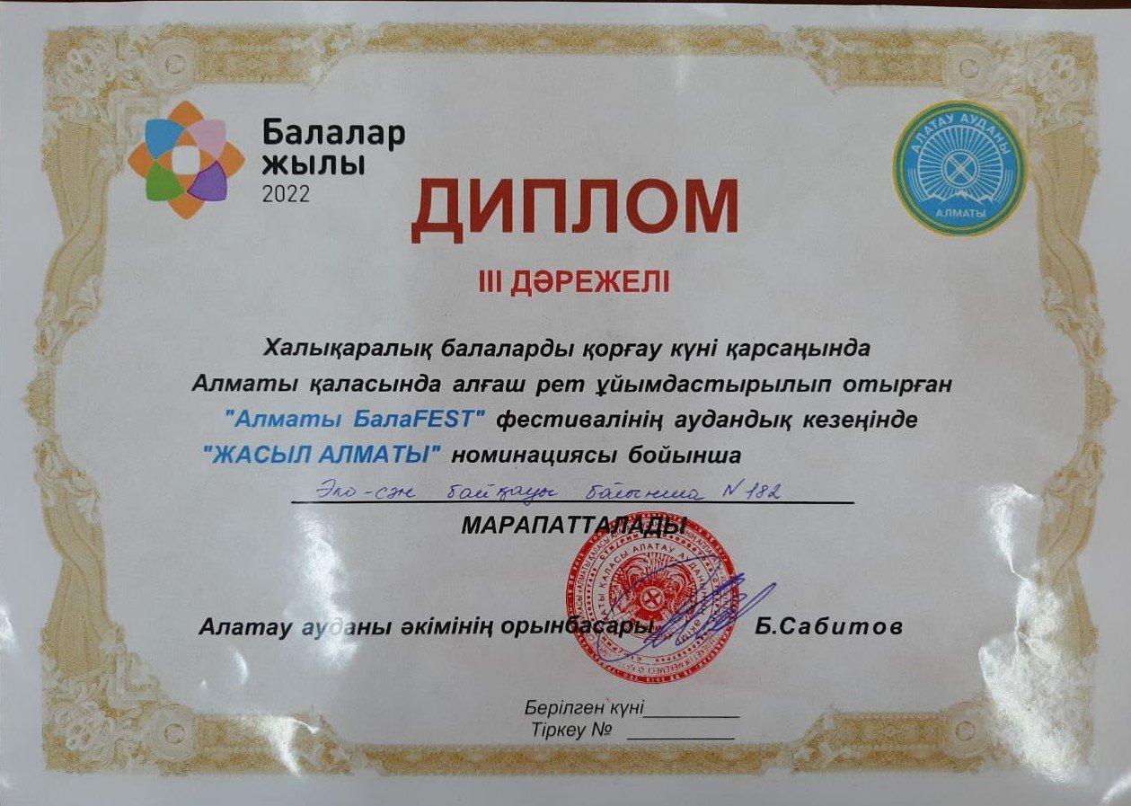Балалар жылы аясында, Халықаралық балаларды қорғау күні қарсаңында республикамыздың үлкен мегаполисі атанған Алматы қаласы білім басқармасының ұйымдастыруымен алғаш рет «Алматы БАЛАFEST» қалалық балалар фестивалі бастау алды. Алатау аудандық Білім бөлімінің ұйымдастыруымен фестивальдің "ЖАСЫЛ АЛМАТЫ", "Экология және жобалық макет, қоршаған орта және Алматы” байқауының аудандық кезеңі өткізілді. Байқаудың мақсаты – балалардың шығармашылық әлеуетін қолдау мен дамыту, Алматы қаласының экологиялық мәселесін оңтайлы шешу және жолдарын қарастыру. Балаларды адамгершілікке, руханилыққа, толеранттылыққа, елжандылыққа тәрбиелеу.