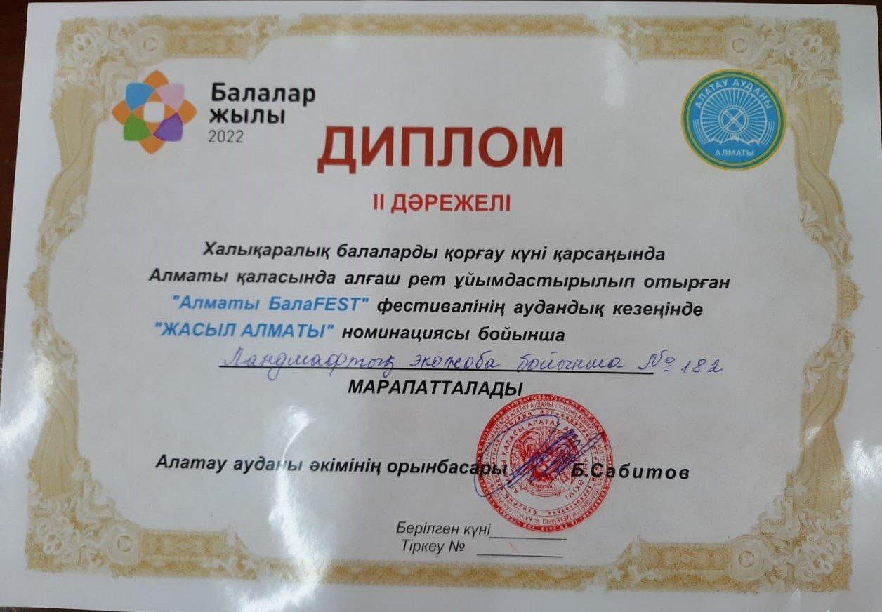 Мектебіміздің оқушылары "Ландшафтық эко жоба" бойынша ІІ дәрежелі Дипломмен, "Эко-сән" бойынша ІІІ дәрежелі Дипломмен, Еркінқызы Шолпан "Жасыл Алматы" номинациясы бойынша Дипломмен марапатталды. Құттықтаймыз!