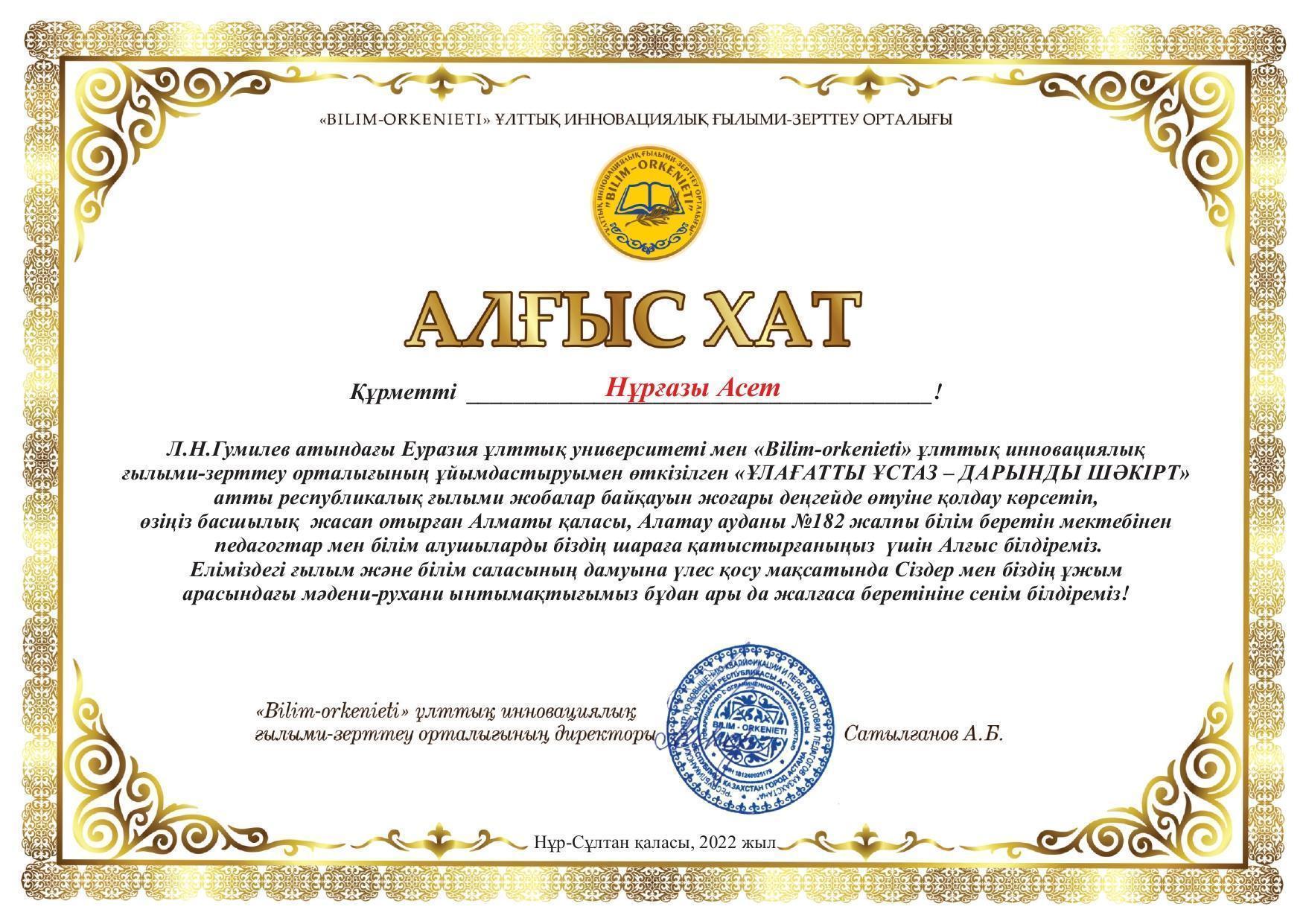 Л.Н.Гумилев атындағы Еуразия ұлттық университеті мен "Bilim-orkenieti" ұлттық инновациялық ғылыми-зерттеу орталығының ұйымдастыруымен өткен "ҰЛАҒАТТЫ ҰСТАЗ - ДАРЫНДЫ ШӘКІРТ" атты республикалық ғылыми жобалар байқауының жоғары деңгейде өтуіне қолдау көрсеткені үшін мектебіміз директоры Нұрғазы Асет Алғыс хатпен марапатталды. Құттықтаймыз!
