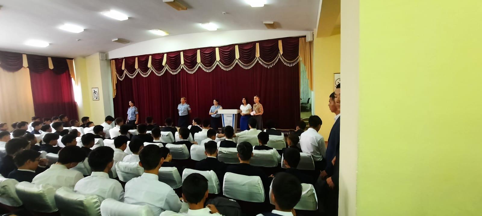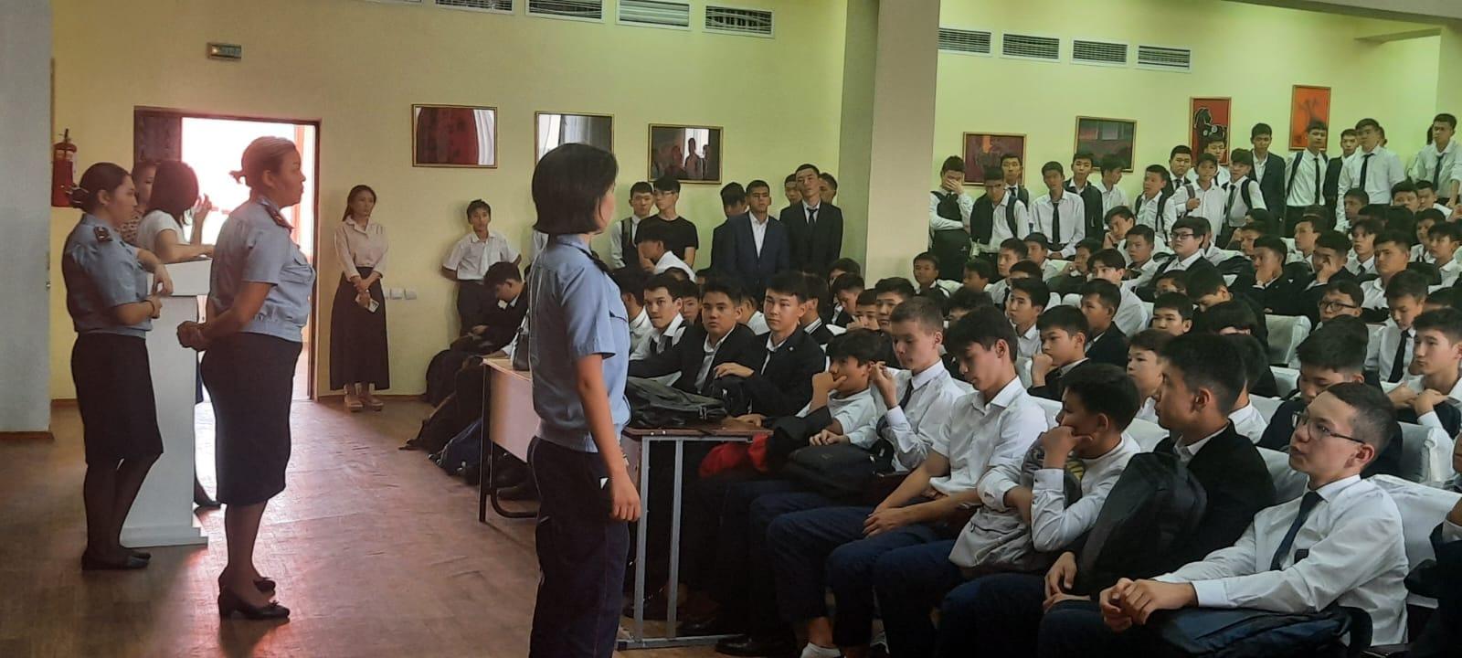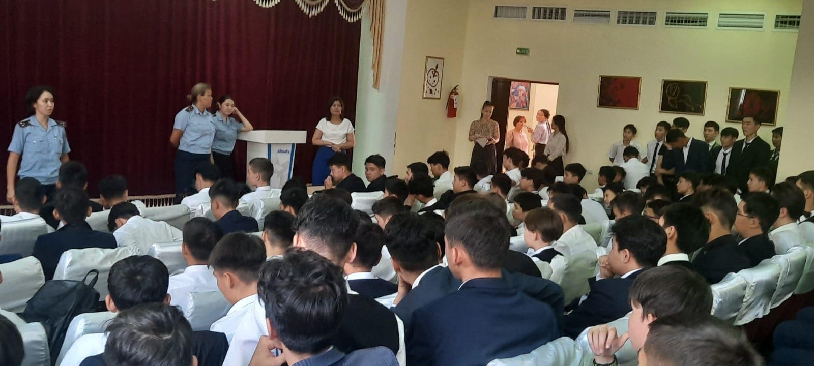 08.09.2022ж. күні 8-11 сыныптың ұл балаларына "Құқық бұзушылықтың алдын алу - басты міндет" тақырыбында жиналыс өткізілді. Жиналыста ұл балалардың тәртібі туралы айтылды. Ұл балалар арасындағы құқық бұзушылықты болдырмау мәселесін Алатау АПБ ЖПҚБ ЮПБ инспекторы, полиция майоры А.О.Алиева, полиция лейтенанты А.Қ.Сүлейменова, мектеп инспекторы, полиция аға лейтенанты А.Нұрбек түсіндірді. Қала оқушыларының арасында орын алып жатқан түрлі келеңсіз жағдайларды айтып, талдау жұмыстарын жүргізді. Директордың тәрбие ісі орынбасарлары А.Хасанова, У.Агадилова ұл балалардың тәртібі, мектеп формасы, гигиеналық тазалығы туралы айтты. Мектеп психологы А.Балтабаева әлеуметтік желілерден төнетін қауіп-қатерлерге тоқталды
