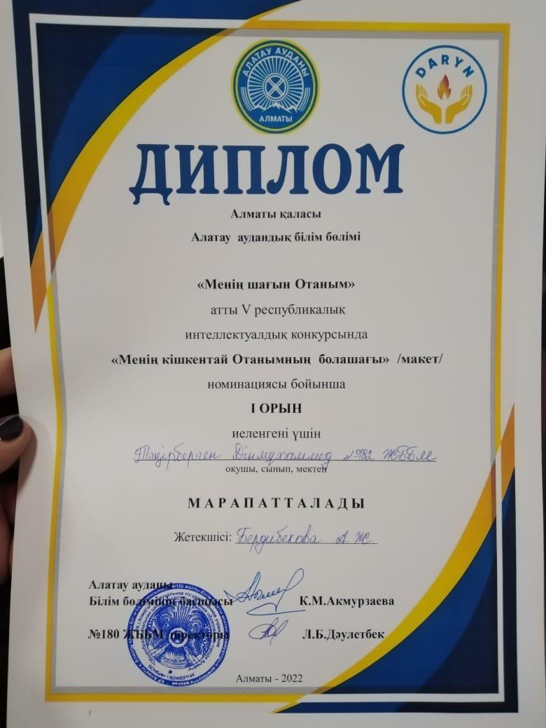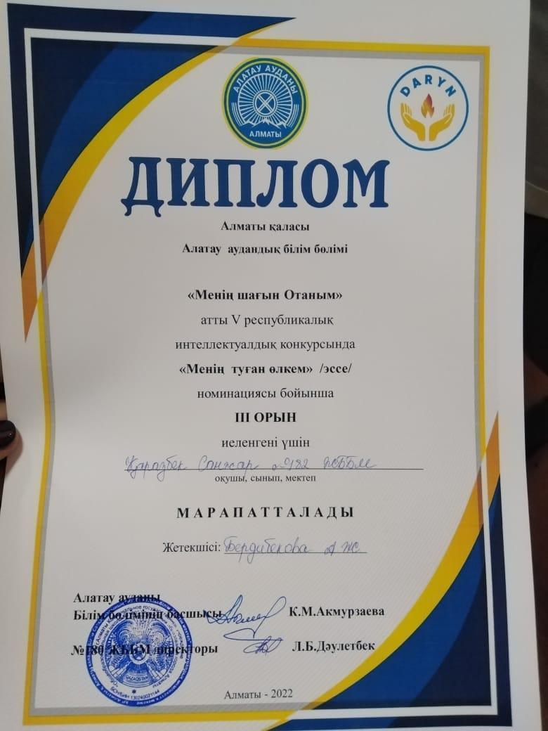 "Менің кішкентай Отанымның болашағы (макет) номинациясы бойынша І орынға, Маратова Дария "Кішкентай Отанымның символы" (бейне) номинациясы бойынша ІІ орынға, Қоразбек Санжар "Менің туған өлкем" конкурсында (эссе) номинациясы бойынша ІІІ орынға ие болып Дипломмен марапатталды.