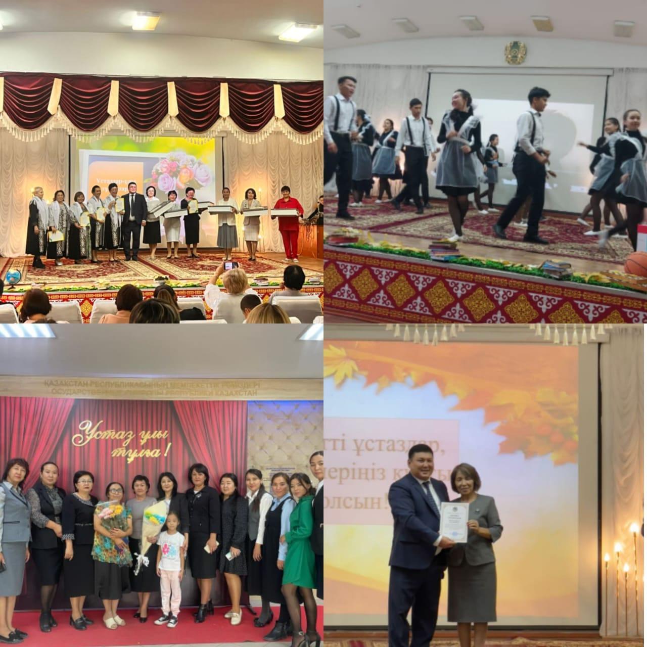 30.09.2022ж. күні ұстаздар қауымының төл мерекесі. Мектебімізде ұстаздар мерекесіне арналған «Ұстаз-ұлы тұлға» тақырыбында әдеби кеш өткізілді. Мақсаты ұстаздардың еңбегін бағалауға, құрметтеуге үйрету. Әдеби кеш жоспарлы түрде өткізілді. Жоспар бойынша оқушылар ұстаздар туралы өлеңдер оқып, әсем ән орындады, би биледі. Ұстаздар мерекесін ұйымдастырған 11 а,ә,б,в сыныптың 110 оқушысы мен сынып жетекшілері Ж.Б.Кирибаева, Г.Нұрқожаева, Г.Сәрсенбаева, Д.Шүленбаевалар өте жоғары дәрежеде өткізді. Сценарий барысында: Олай болса бүгінгі күн ұстаздарға арналмақ. Ұстаз -ұлағатты есім. Күн сәулесі өмірге қандай жарық берсе, ұстаз есімі де шәкірттерге күндей жарық береді деп аяқтады.