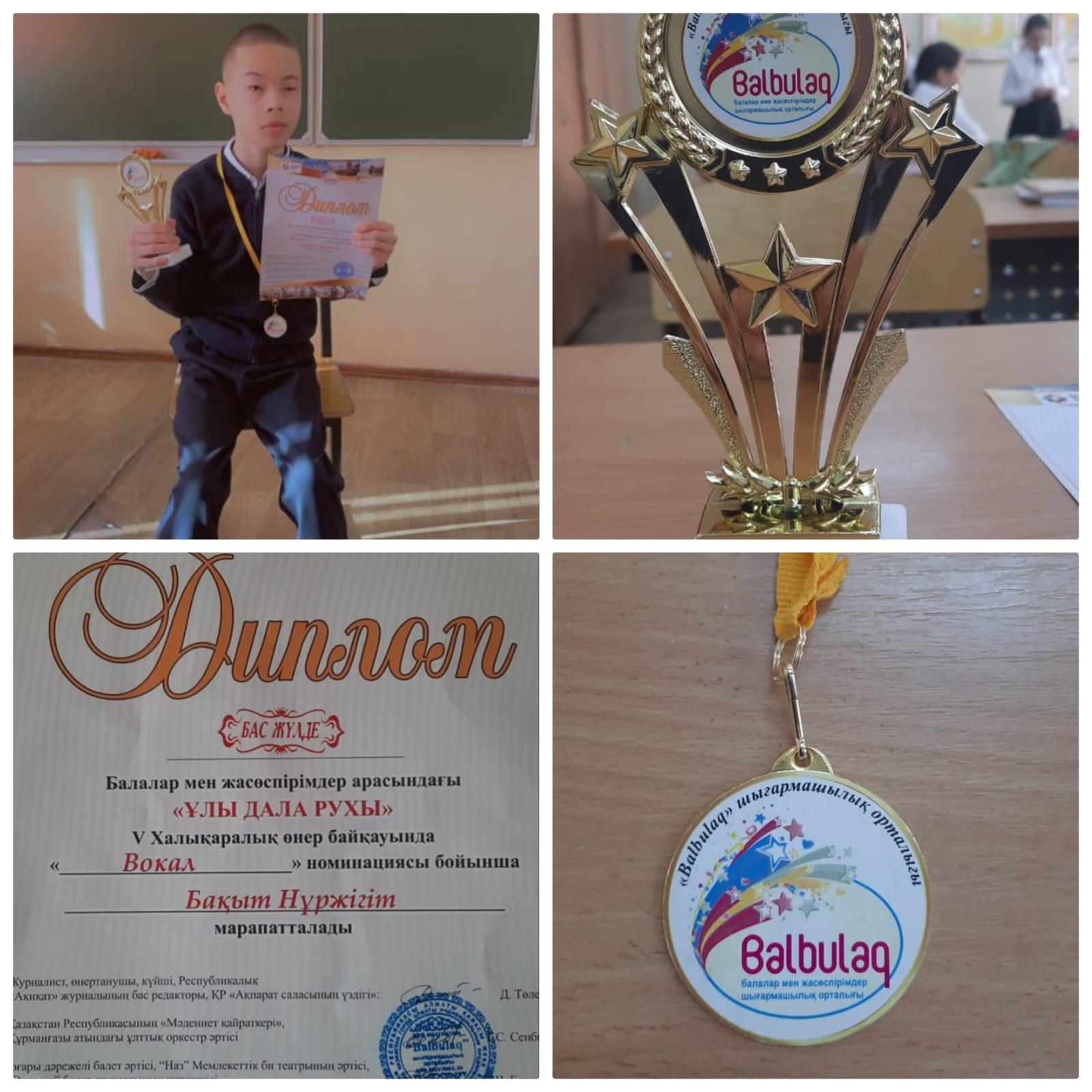 ОҚУШЫЛАРЫМЫЗДЫҢ ЖЕТІСТІКТЕРІ Мектебіміздің 6-сынып оқушысы Бақыт Нұржігіт балалар мен жасөспірімдер арасындағы "ҰЛЫ ДАЛА РУХЫ" V Халықаралық өнер байқауында "Вокал" номинациясы бойынша Бас жүлдеге ие болды. Құттықтаймыз! Талабыңызға нұр жаусын!