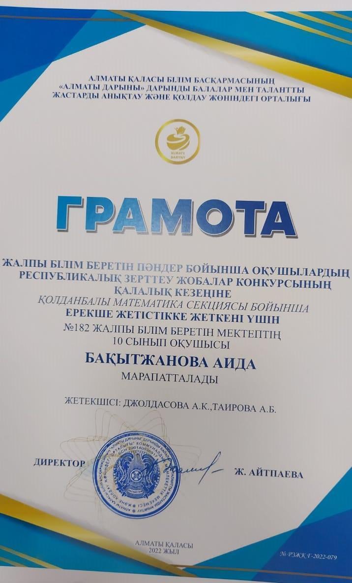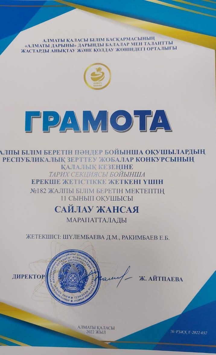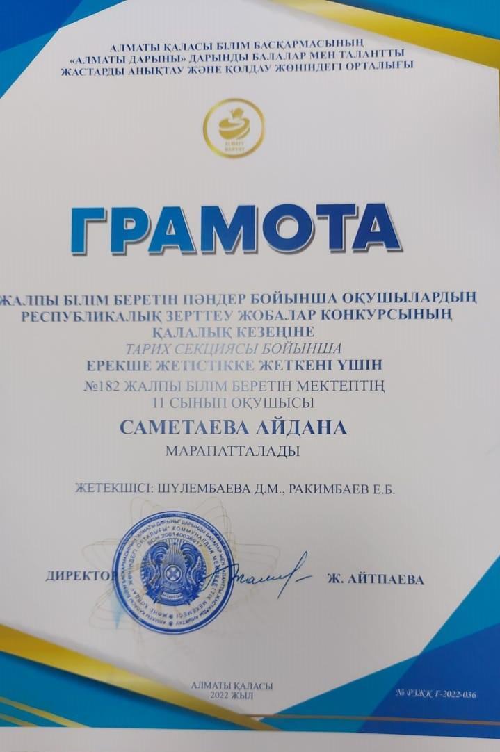 Жалпы білім беретін пәндер бойынша оқушылардың республикалық зерттеу жобалар конкурсының қалалық кезеңінде ерекше жетістіктерге жеткені үшін мектебіміздің оқушылары қолданбалы математика секциясы бойынша 10-сынып оқушылары Оразмухамет Альмира, Бақытжанова Аида, тарих секциясы бойынша 11-сынып оқушылары Саметаева Айдана, Сайлау Жансая Грамоталармен марапатталды. Жетекшілері математика пәні мұғалімдері А.К.Джолдасова, А.Б.Таирова, тарих пәні мұғалімі Д.М.Шүлембаева. Құттықтаймыз!💐💐💐