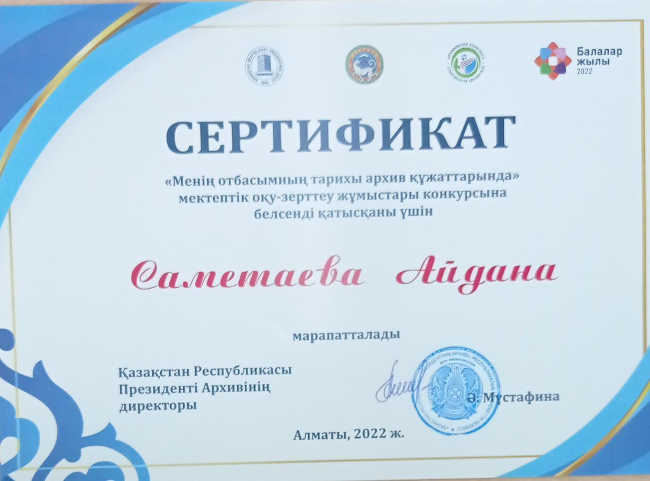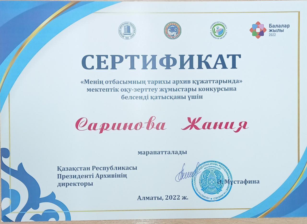 Мектебіміздің оқушылары Саринова Жания, Саметаева Айдана, Тасман Малика "Менің отбасымның тарихы архив құжаттарында" мектептік оқу-зерттеу жұмыстары конкурсына белсенді қатысқаны үшін сертификатпен марапатталды. Құттықтаймыз!💐💐💐