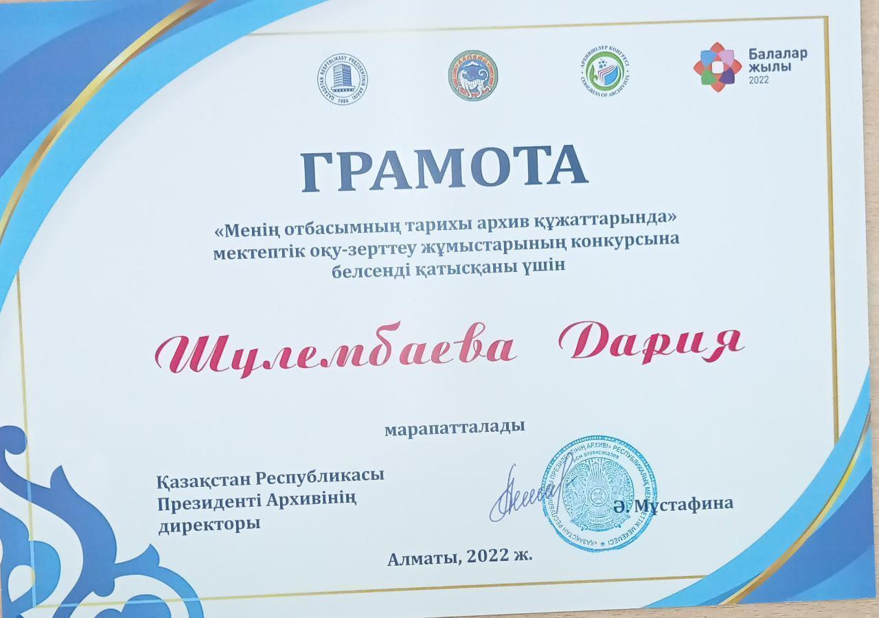 Мектебіміздің тарих пәні мұғалімдері Садыкова Жакен Жунусбековна мен Шүлембаева Дария Мүшенқызы "Менің отбасымның тарихы архив құжаттарында" мектептік оқу-зерттеу жұмыстарының конкурсы грамотасымен марапатталды. Құттықтаймыз!💐💐💐