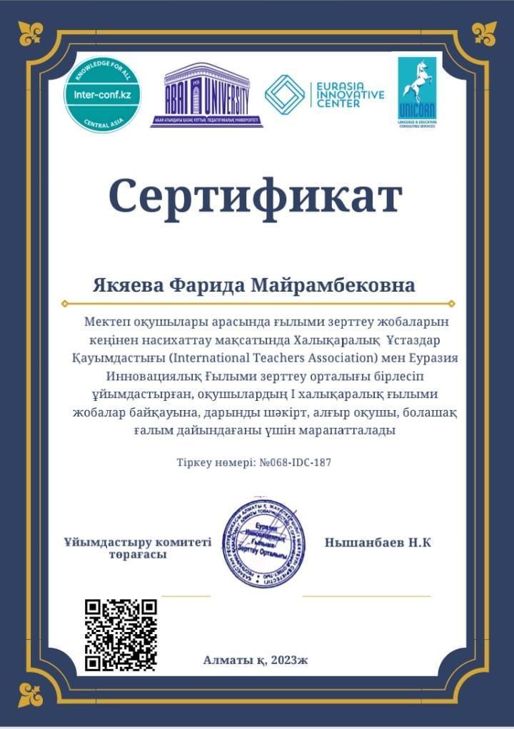 Мектеп оқушылары арасында ғылыми зерттеу жобаларын кеңінен насихаттау мақсатында Халықаралық ұстаздар Қауымдастығы мен Еуразия Инновациялық Ғылыми зерттеу орталығы бірлесіп ұйымдастырған, оқушылардың І халықаралық ғылыми жобалар байқауында мектебіміз оқушысы Ерлан Еркежан Ернарқызы І дәрежелі Дипломмен марапатталды. Жетекшісі ағылшын тілі пәні мұғалімі Якяева Ф.М. Құттықтаймыз!!!💐💐💐