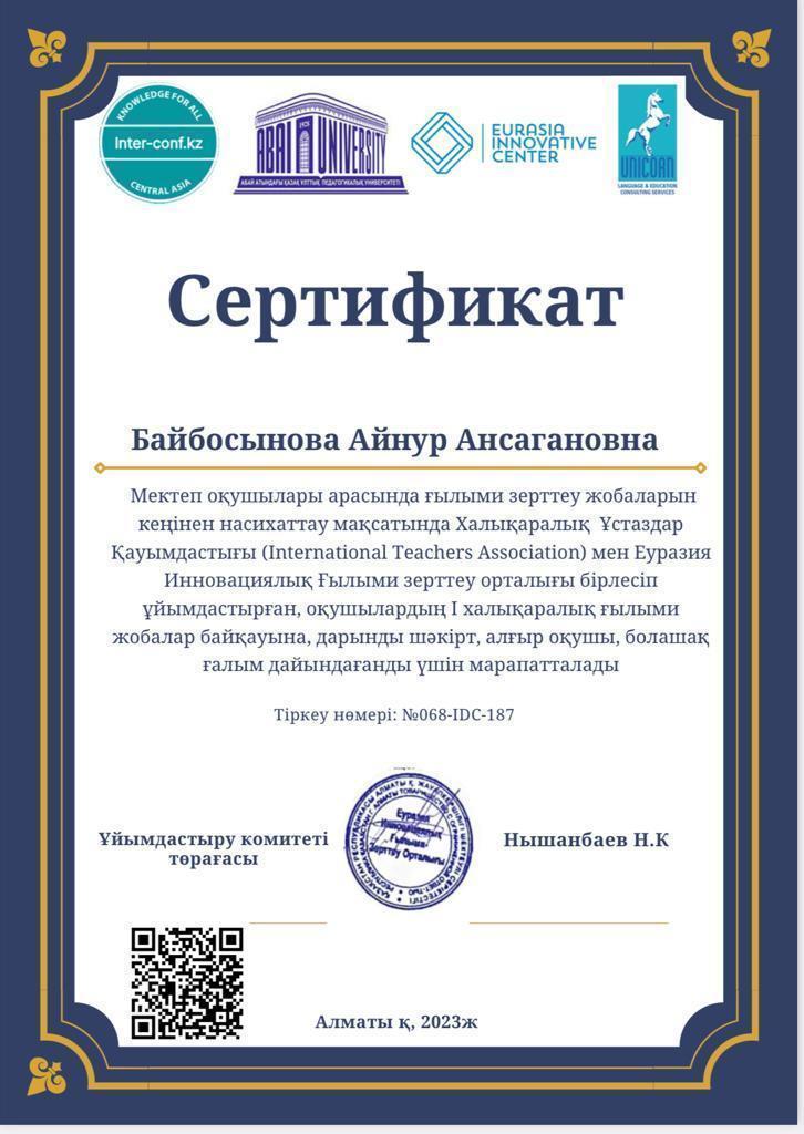 Мектеп оқушылары арасында ғылыми зерттеу жобаларын кеңінен насихаттау мақсатында Халықаралық ұстаздар Қауымдастығы мен Еуразия Инновациялық Ғылыми зерттеу орталығы бірлесіп ұйымдастырған, оқушылардың І халықаралық ғылыми жобалар байқауында мектебіміз оқушысы Оразханов Назарбай Болатбекұлы ІІ дәрежелі Дипломмен марапатталды. Жетекшілері биология пәні мұғалімі Г.А. Кульбаева мен ағылшын тілі пәні мұғалімі А.А.Байбосынова.