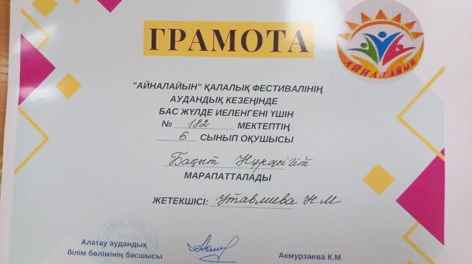 "Айналайын"қалалық фестивалінің аудандық кезеңінде мектебіміздің 6-сынып оқушысы Бақыт Нұржігіт Бас жүлдеге ие болды. Жетекшісі Утавлиева Н.М. Құттықтаймыз! Байқаудың қалалық кезеңіне сәттілік тілейміз!