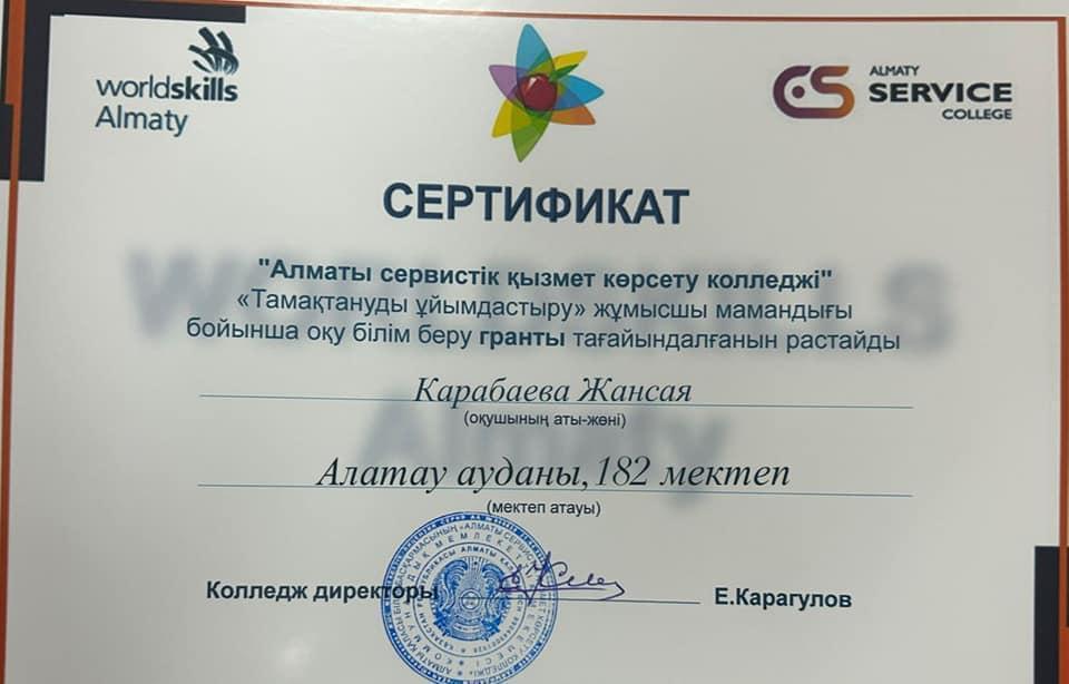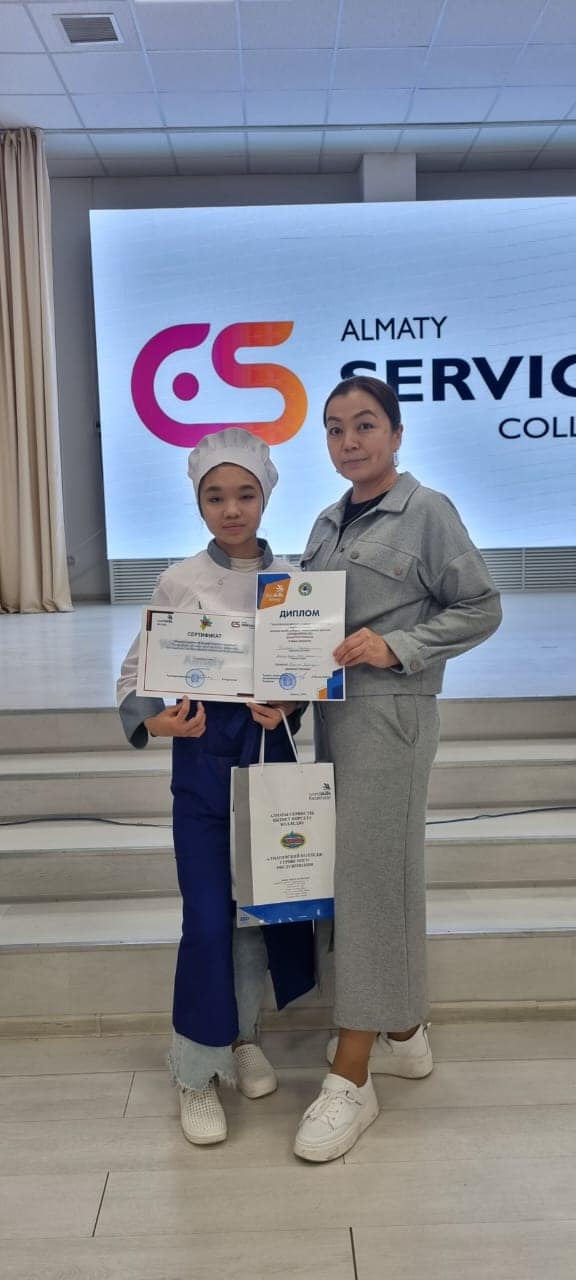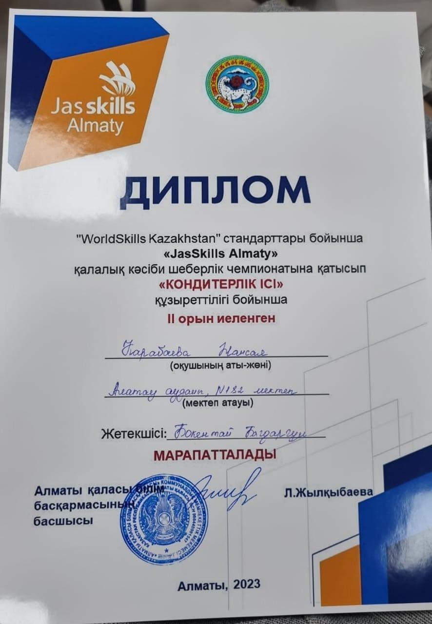 "WorldSkills Kazakhstan" стандарттары бойынша "JasSkills Almaty" қалалық кәсіби шеберлік чемпионатына қатысып "Кондитерлік ісі" құзыреттілігі бойынша мектебіміздің оқушысы Карабаева Жансая ІІ орынға ие болды және "Алматы сервистік қызмет көрсету колледжі" "Тамақтануды ұйымдастыру" жұмысшы мамандығы бойынша оқу білім беру грантын жеңіп алды. Жетекшісі Бөкентай Б. Құттықтаймыз!