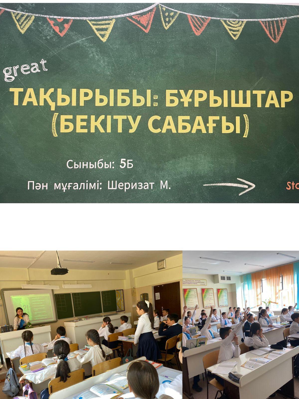 20.04.2023ж. күні «Бүгінгі жас мамандар ертеңгі ұлағатты ұстаз» тақырыбындағы жас мамандар онкүндігі аясында математика пәні мұғалімі Шеризат Мерей 5”Б” сыныбына “Бұрыштар” тақырыбында ашық сабақ өтті.