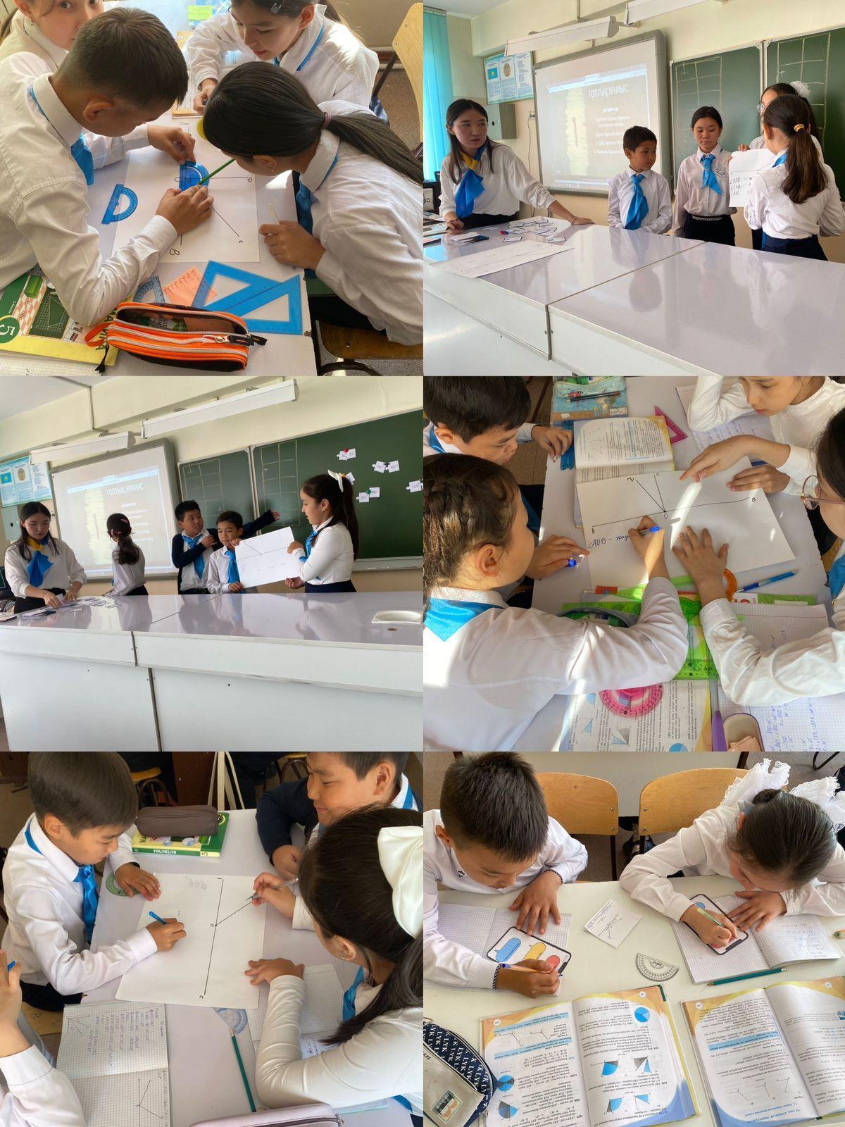 Сабақ барысының ұйымдастыру кезеңінде мұғалім оқушыларға сәттілік тілеп, ынтымақтастық атмосферасын ұйымдастыра отырып, оқушылар назарын сабаққа аудару көзделді. “Поезд әдісін” бойынша үй тапсырмасы сұралды. Өткен тақырып пен бекіту сабағын байланыстыру мақсатында “сұрақ жауап” әдісін пайдаланып және online-stopwatch кездейсоқ оқушы таңдап жауап беру арқылы өткен тақырыпқа шолу жасады. Бекіту сабағы бойынша бұрыштардың түрін анықтау және бұрышты белгілеуімен жазу мақсатында оқушыларға топтық жұмыс берілді. “Пазл” әдісі бойынша оқушылар бұрыштың градусын өлшеп сәйкес градусын табу үшін жұптық тапсырма орындады. Логикалық сұрақтар қою арқылы сергіту сәтін өткізді. Оқушылар деңгейлік тапсырма орындау мақсатында жеке жұмыс тапсырмалары берілді. Мұғалім оқушылардың отырған орны бойынша тақтада үйашыққа “+” қою арқылы оқушыларды бағалады , ең көп “+” алған оқшуы 9-10 баллмен, “+” саны орташа 7-8 баллмен, бір ғана “+” барлар 6-7 баллмен бағаланды. Кері байланыс “Пікір қалдыру” әдісі бойынша әр оқушы сабақтан өзінің білетінін, білгенін, сұрағын телефон тәріздес кері байланыс парағында пікір қалдырды, мұғалім оқып оқушыларға кері байланыс берді.