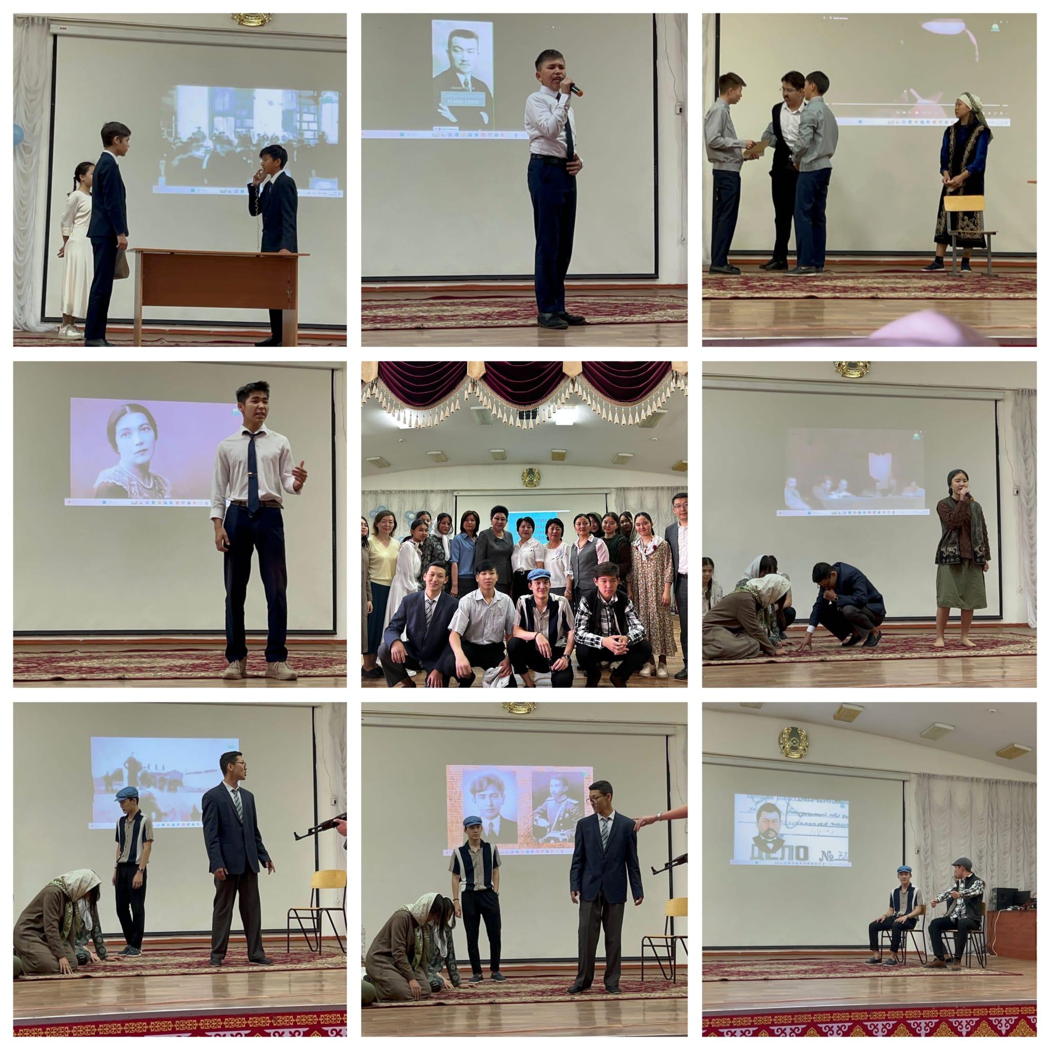Қоғамдық – гуманитарлық пән бірлестігі, тарих пәні мұғалімдерінің ұйымдастыруымен 31 – мамыр 31 мамыр - Саяси қуғын-сүргін құрбандарын еске алу күніне орай «Алаш туы астында, Күн сөнгенше сөнбейміз!» атты тарихи-әдеби кеш өтті. Кештің мақсаты — қазіргі жастардың патриоттық сезімі мен ұлтқа деген махаббатын ояту және Алаш зиялыларының елі, жері дегенде қалай жан аямай күресіп, үлкен ерен еңбектер атқарғанынан құлағдар ету. Толкинова Ж.Н. ұйымдастыруымен 10 "В" сынып оқушылары ашаршылық зұлматын көрініс арқылы сомдаса, Кирибаева Ж.Б. бастаған 9-сынып оқушылары Алаш зиялыларының кезіндегі сауаттылық пен ұлт тағдыры үшін күрескендігі жайлы көріністен шағын үзінді келтіре, домбырасын күмбірлете күйін шертіп, жанды дауыста әндер орындады.