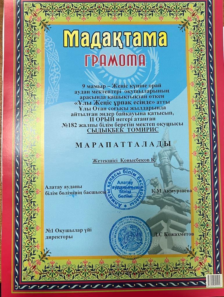 "Ұлы Жеңіс ұрпақ есінде" атты Ұлы Отан соғысы жылдарында айтылған әндер байқауына мектебіміздің оқушысы Сыдықбек Томирис қатысып, жүлделі ІІ орынға ие болды