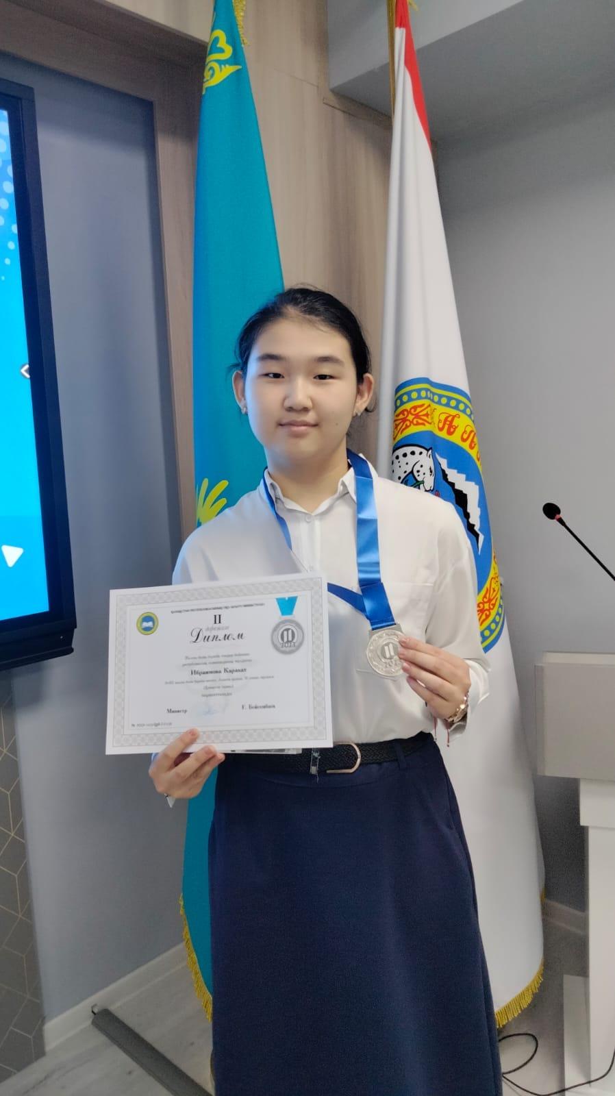 Мектебіміздің 10-сынып оқушы Ибраимова Карақат жалпы білім беретін пәндер бойынша республикалық олимпиадада Қазақстан тарихы пәнінен жүлдегер атанып, ІІ дәрежелі Дипломмен марапатталды. Жетекшісі тарих пәні мұғалімі Ж.Толкинова. Құттықтаймыз!!!