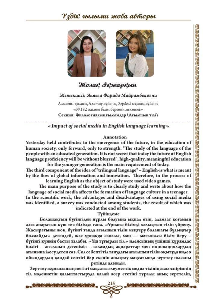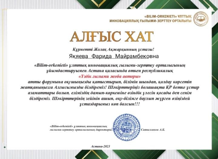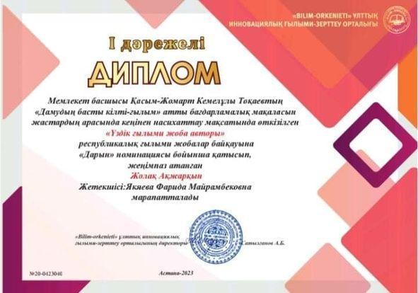 Мемлекет басшысы Қасым-Жомарт Кемелұлы Тоқаевтың "Дамудың басты кілті - ғылым" атты бағдарламалық мақаласын жастардың арасында кеңінен насихаттау мақсатында өткізілген "Үздік ғылыми жоба авторы" республикалық ғылыми жобалар байқауына "Дарын" номинациясы бойынша қатысып, жеңімпаз атанған мектебіміз оқушысы Жолақ Ақжарқын І дәрежелі Дипломмен марапатталды. Жетекшісі ағылшын тілі пәні мұғалімі Якяева Фарида Мейрамбековна Алғыс хатпен марапатталды. Құттықтаймыз!