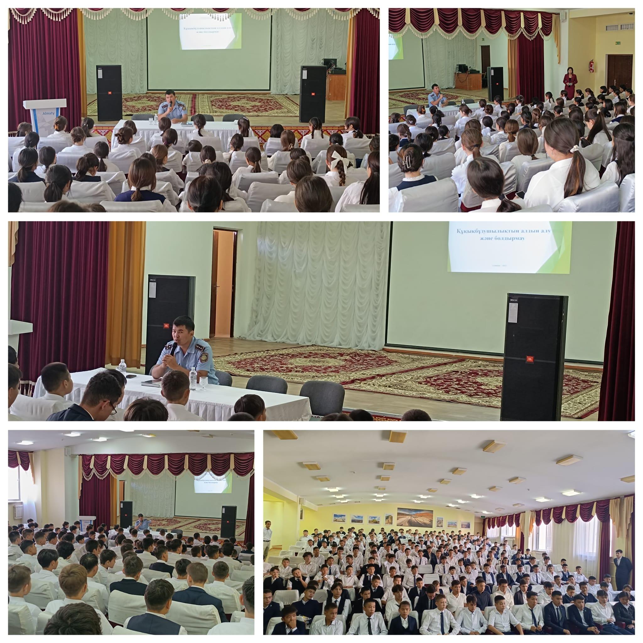 07.09.2023ж. күні мектебіміздің 8-9-10-11 сыныптардың 1400 оқушысына «Құқықбұзушылықтың алдын алу және болдырмау» тақырыбында Алатау аудандық ІІБ АПБ ЮПБ бөлім бастығы, полиция майоры И.М.Дарикулов жиналыс өткізді. Түсіндірме жұмысының мақсаты: оқушылардың арасында құқықбұзушылықты болдырмау. Ұсақ бұзақылықты жасаудан сақтандыру. Күнделікті орын алатын оқыс оқиғалар мен қиын жағдайлардан сақтануды түсіндіру. Кәмелетке толмағандар арасында орын алып жатқан түрлі жағдайлардың зардаптары мен келтірілген зияндары туралы түсіндірме жұмыстары жүргізілді. Оқушылар арасында осындай құқықбұзушылыққа жол бермеу керектігі айтылды. Түнгі уақытта ата-ананың рұқсатынсыз жүрмеу ескертілді. Оқушының міндеттері мен жауапкершілігі түсіндірілді.