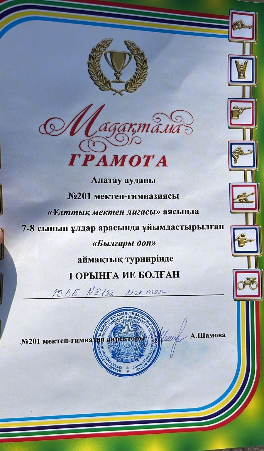 28 қыркүйек 2023 0 1 2 3 4 5 Оқушыларымыздың жетістіктері ОҚУШЫЛАРЫМЫЗДЫҢ ЖЕТІСТІКТЕРІ"Ұлттық мектеп лигасы" аясында 7-8 сынып ұлдары арасында ұйымдастырылған "Былғары доп" аймақтық турнирінде мектебіміз командасы І орынға ие болды. Құттықтаймыз! Осы беттің QR-коды:QR-код этой страницы: