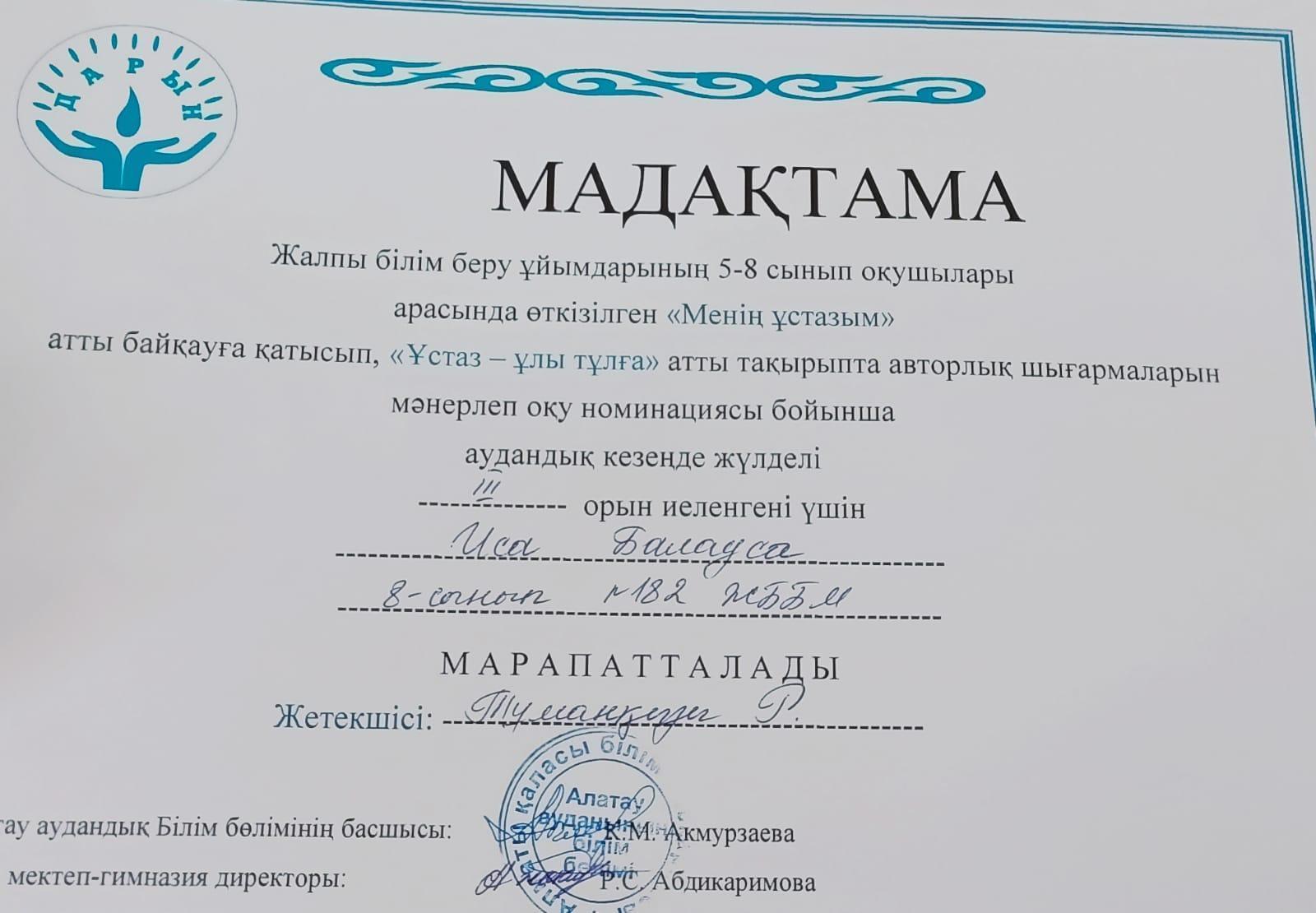 28.09.2023ж. күні 5-8 сынып оқушылары арасында аудандық "Менің ұстазым" байқауында "Ұстаз-ұлы тұлға" номинациясы бойынша өз туындысын оқып, 2-кезеңде топ жарған 8"В" сынып оқушысы Иса Балауса 3-орын алды. Жетекшісі қазақ тілі мен әдебиеті пәні мұғалімі Тұманқызы Рауан. Құттықтаймыз! 💐💐💐