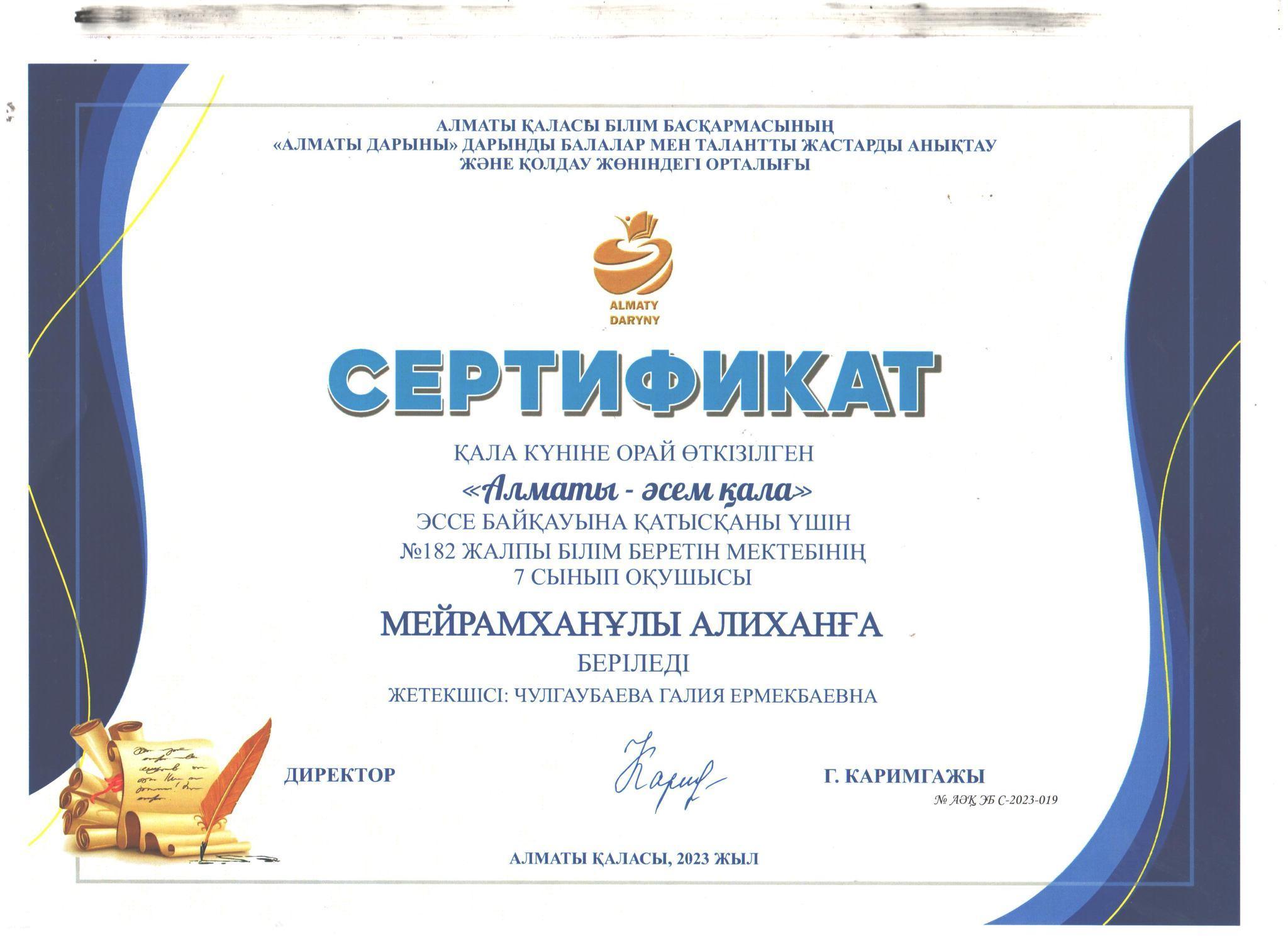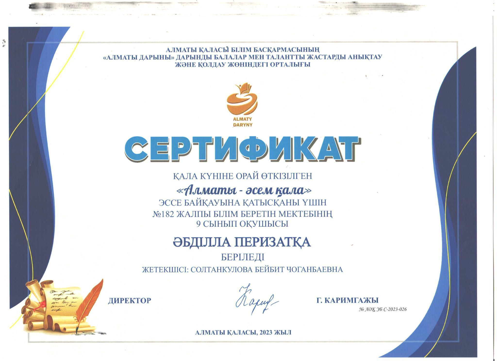 Қала күніне орай өткізілген "Алматы - әсем қала" эссе байқауында 7-сынып оқушысы Мейрамханұлы Алихан, жетекшісі орыс тілі пәні мұғалімі Чулгаубаева Г.Е., 9-сынып оқушысы Әбділла Перизат, жетекшісі орыс тілі пәні мұғалімі Солтанкулова Б.Ч. сертификаттармен марапатталды. Құттықтаймыз!