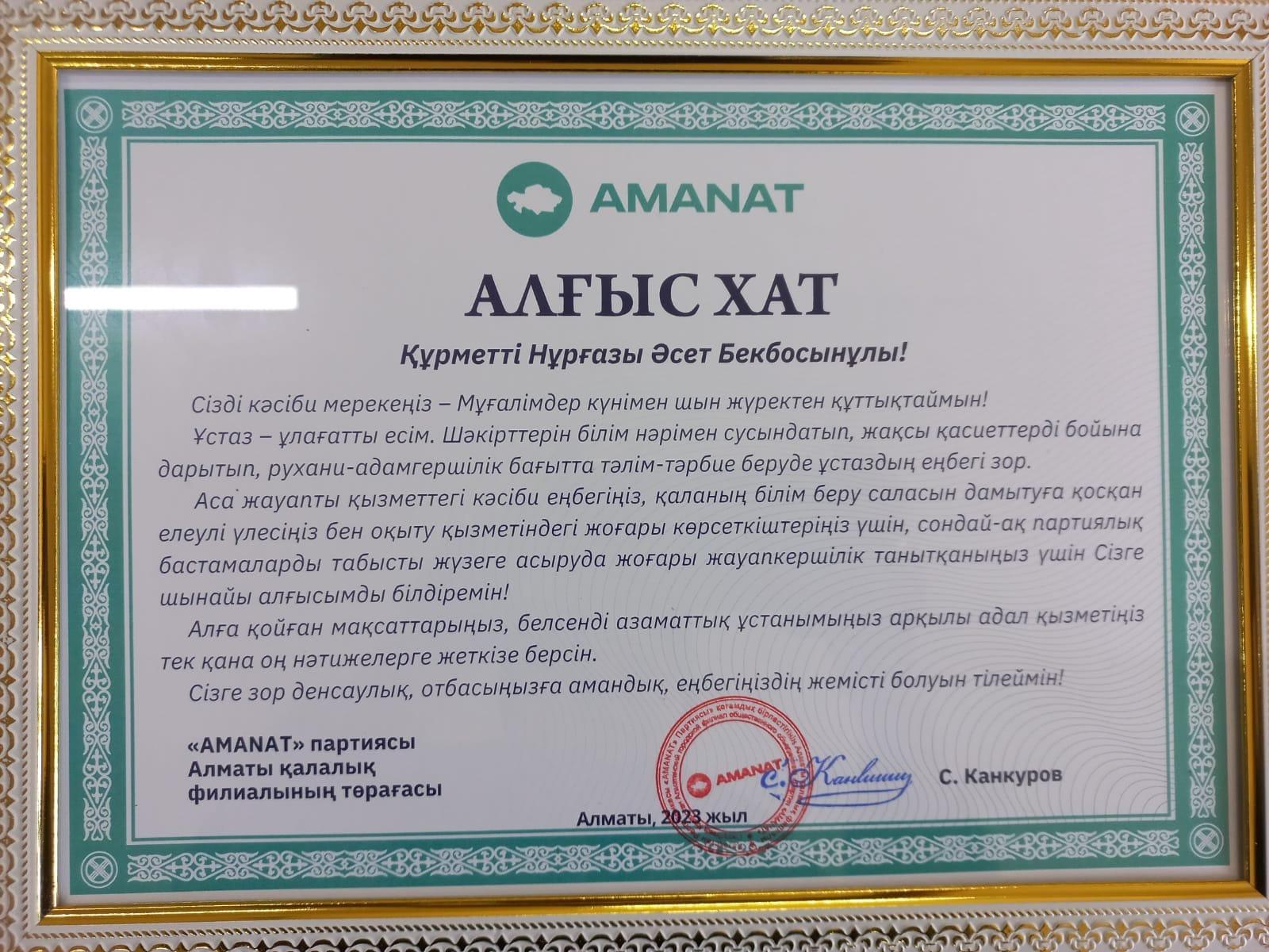 05 қазан 2023 0 1 2 3 4 5 Мерекедегі марапаттар Мектебіміз директоры Нұрғазы Асет Бекбосынұлы "AMANAT"партиясы Алматы қалалық филиалының төрағасы С.Канкуровтың Алғыс хатымен марапатталды. Құттықтаймыз! Еңбегіңіз еленіп, абыройыңыз асқақтай берсін! Осы беттің QR-коды:QR-код этой страницы: