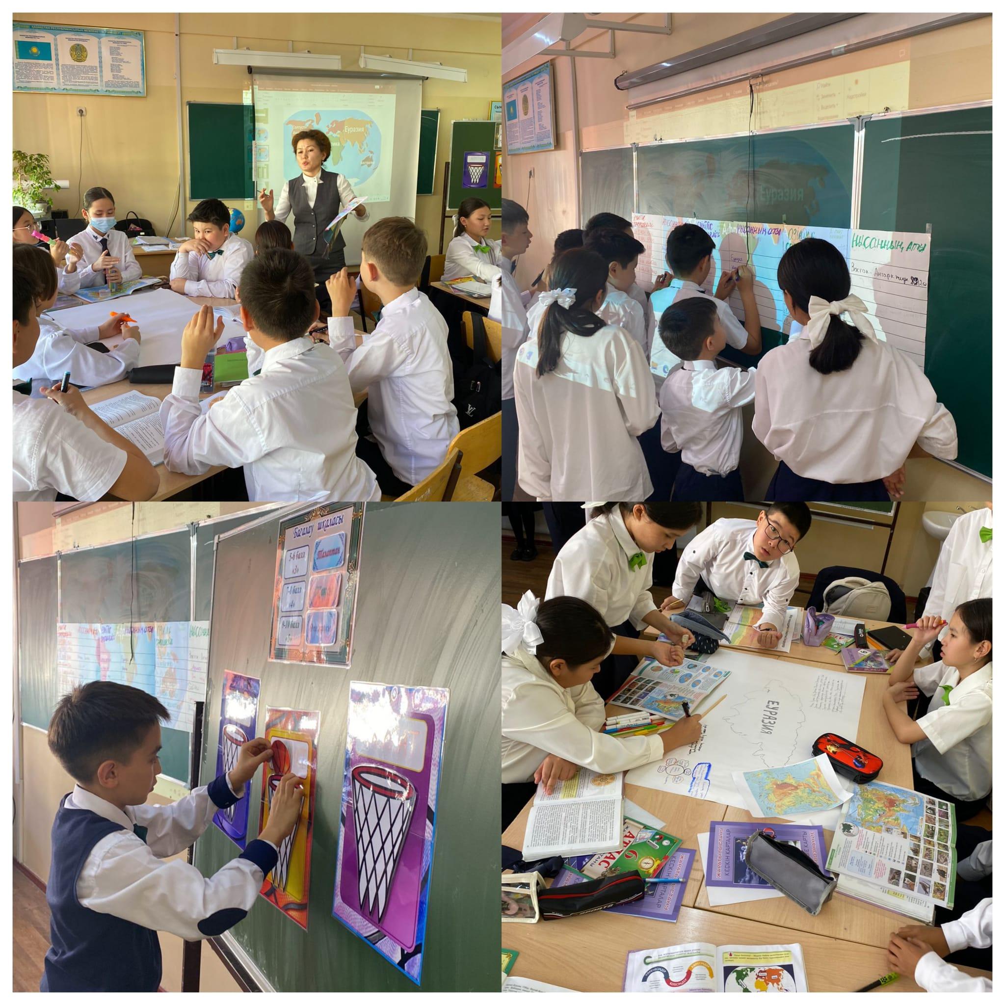 Сабақ барысының ұйымдастыру кезеңінде мұғалім «Жылы алақан» әдісі арқылы бір-біріне жылы лебіздерін жеткізіп, ынтымақтастық атмосферасын ұйымдастыра отырып, оқушылардың назарын сабаққа аудару көзделді. Жаңа сабақты ынталандыру мақсатында «Миға шабуыл» әдісі арқылы оқушылар өткен тақырыпты пысықтап, мұғалімнің жердің пайда болуы, ішкі және сыртқы құрылысы жайлы қойылған сұрақтарына жауып беріп, оқушыларды «өте жақсы», «жарайсың» деген мақтау сөздермен бағалап кері байланыс жасап өтті. Видеоролик көрсете отырып материктерді анықтау арқылы сабақтың тақырыбы мен мақсаттарын өздері ашуына ықпал жасалды. Сонымен қатар жаңа тақырыптың мазмұнын ашу мақсатында «Стоп кадр» әдісі ұсынылып, видеоролик көрсетілді. «Баскетбол әдісі » бойынша үш топқа бөлінеді: «Материк» тобы, «Климат»тобы, «Табиғат» тобы.