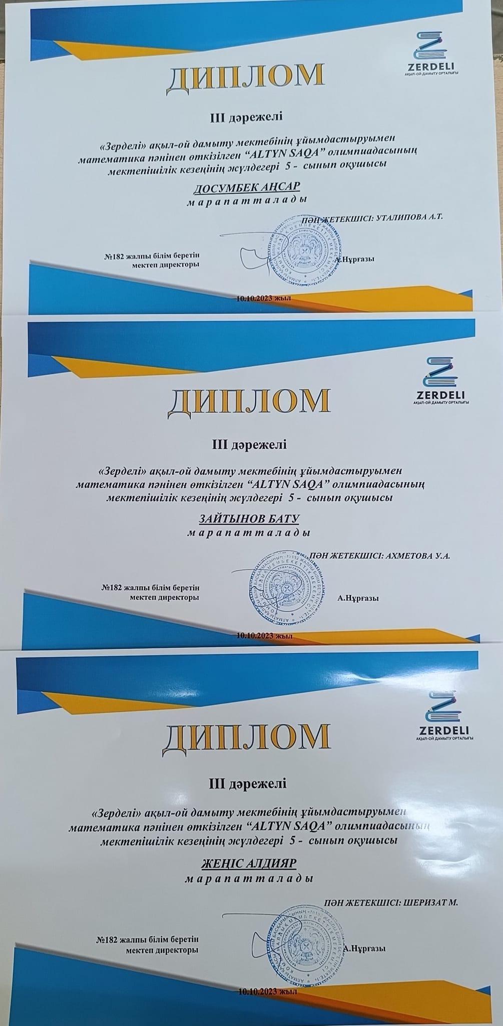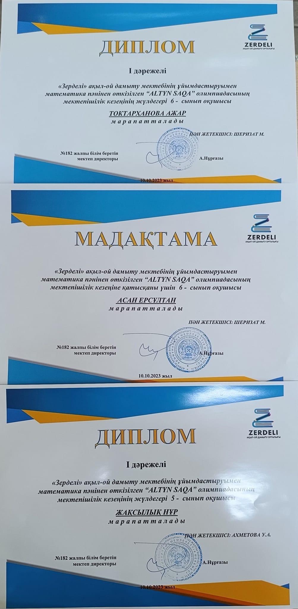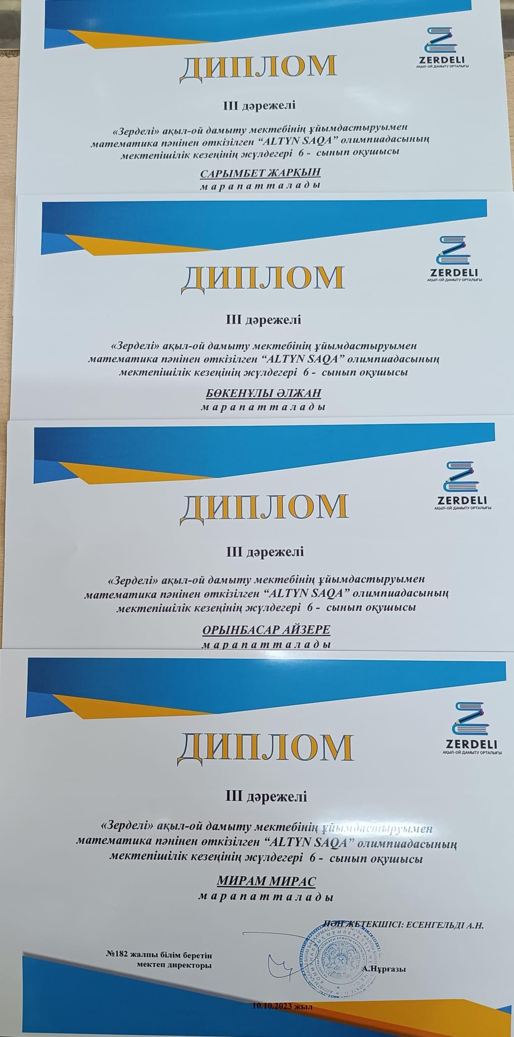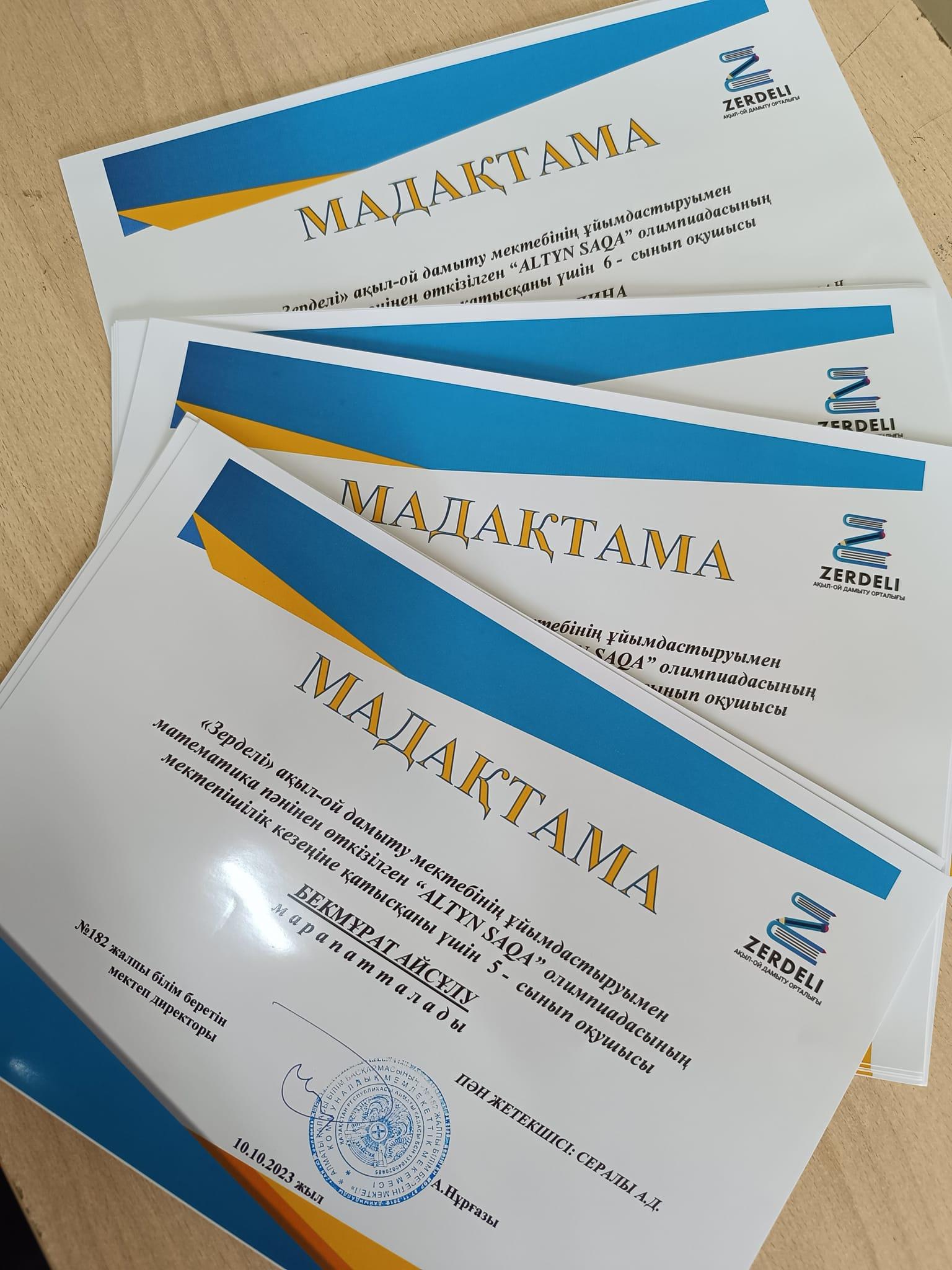 "Зерделі" ақыл-ой дамыту мектебінің ұйымдастыруымен математика пәнінен өткізілген "ALTYN SAQA" олимпиадасының мектепішілік кезеңінде оқушыларымыз І,ІІ,ІІІ орындарға ие болып, мадақтама қағазымен марапатталды. Құттықтаймыз!