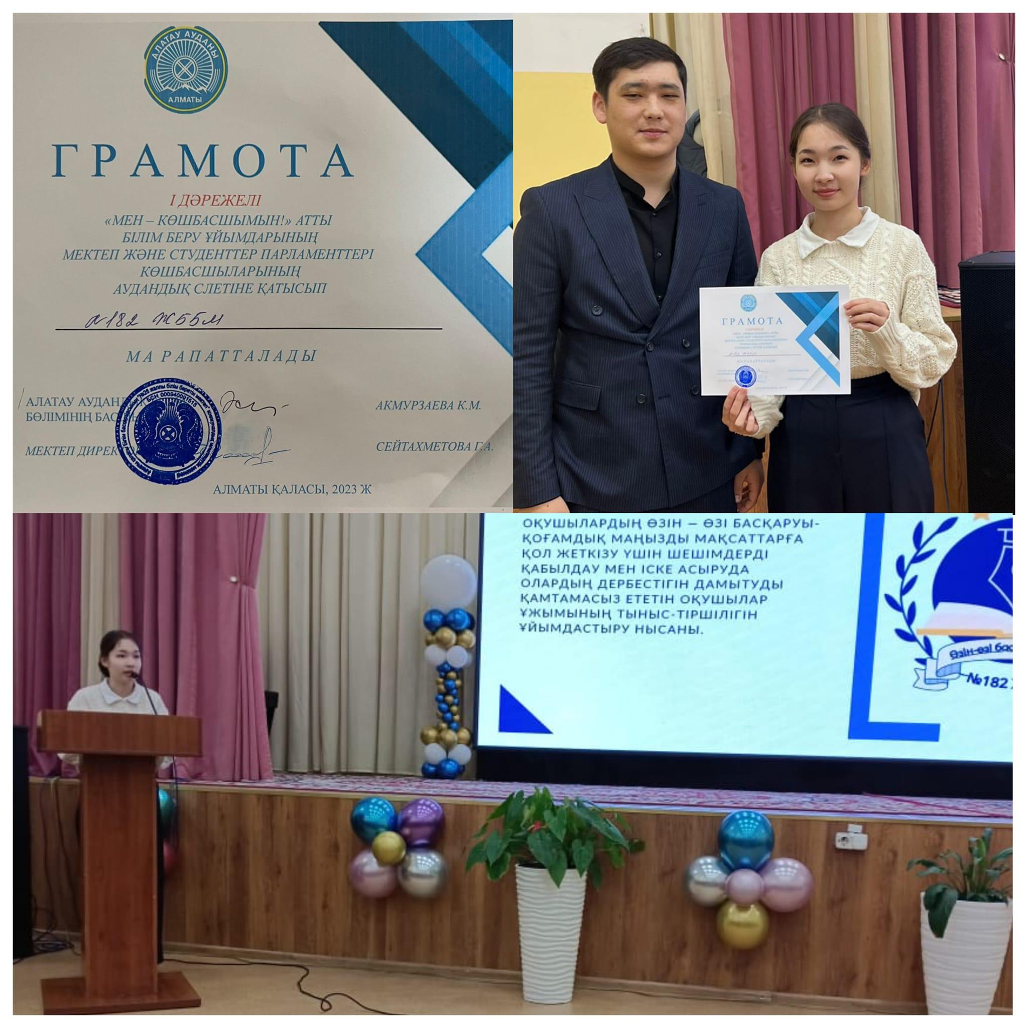 "Мен-көшбасшымын!" атты білім беру ұйымдарының мектеп және студенттер парламенттері көшбасшыларының аудандық слетінде мектебіміз президенті І дәрежелі дипломға ие болды. Құттықтаймыз! Қалалық кезеңге сәттілік тілейміз!