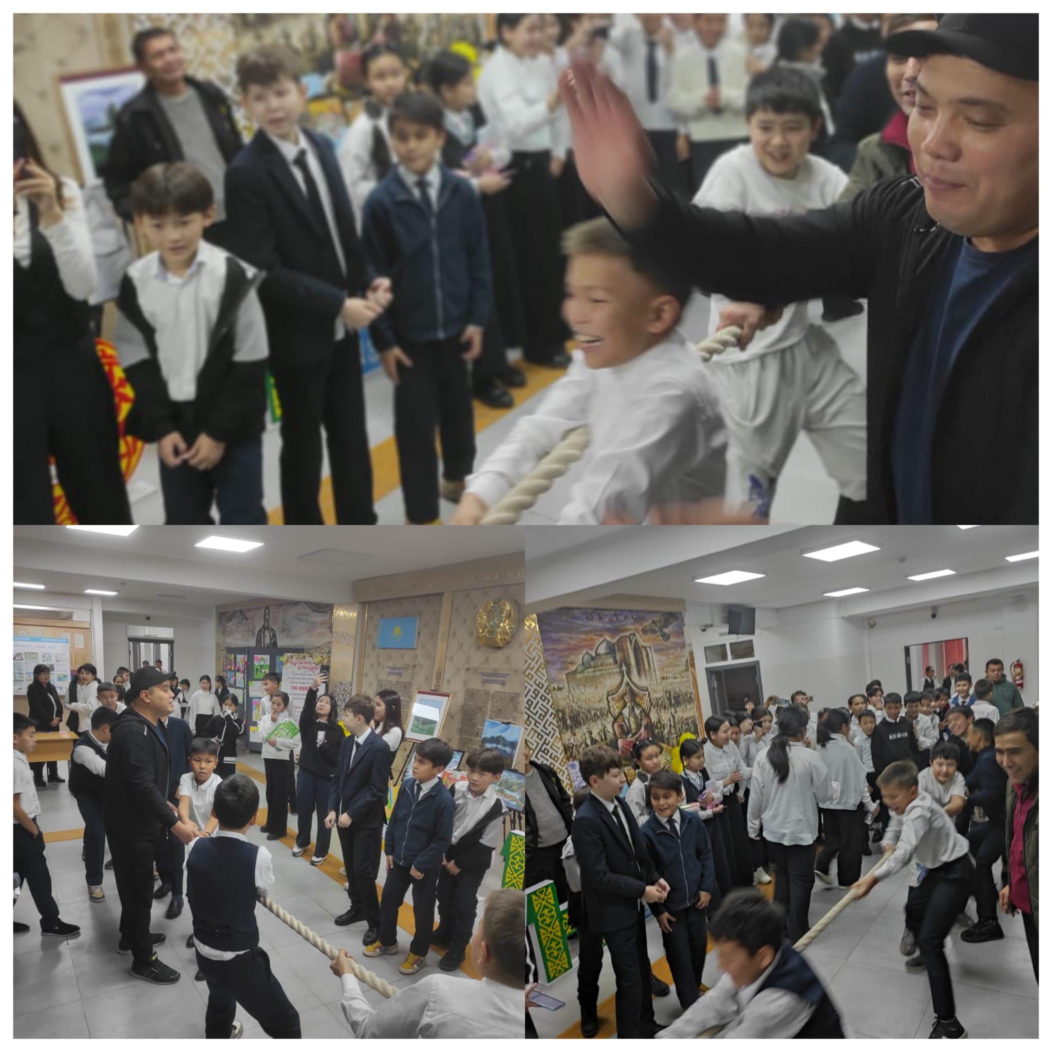 07.12.2023ж. күні Алматы қаласы Алатау ауданы №182 жалпы білім беретін мектепте "Өнерлі ұрпақ - Тәуелсіз елдің жарқын жұлдызы" тақырыбындағы эстетикалық пәндер бірлестігінің онкүндігі аясында дене шынықтыру пәнінің мұғалімдері Ізжанов Данияр мен Қалмұқанов Ержан 6-7 сыныптар арасында қазақтың ұлттық ойыны "Арқан тартыс" ойынынан көңілді қоңырау өткізді. Мақсаты қазақ қалқының ұлттық ойындарын насихаттау.