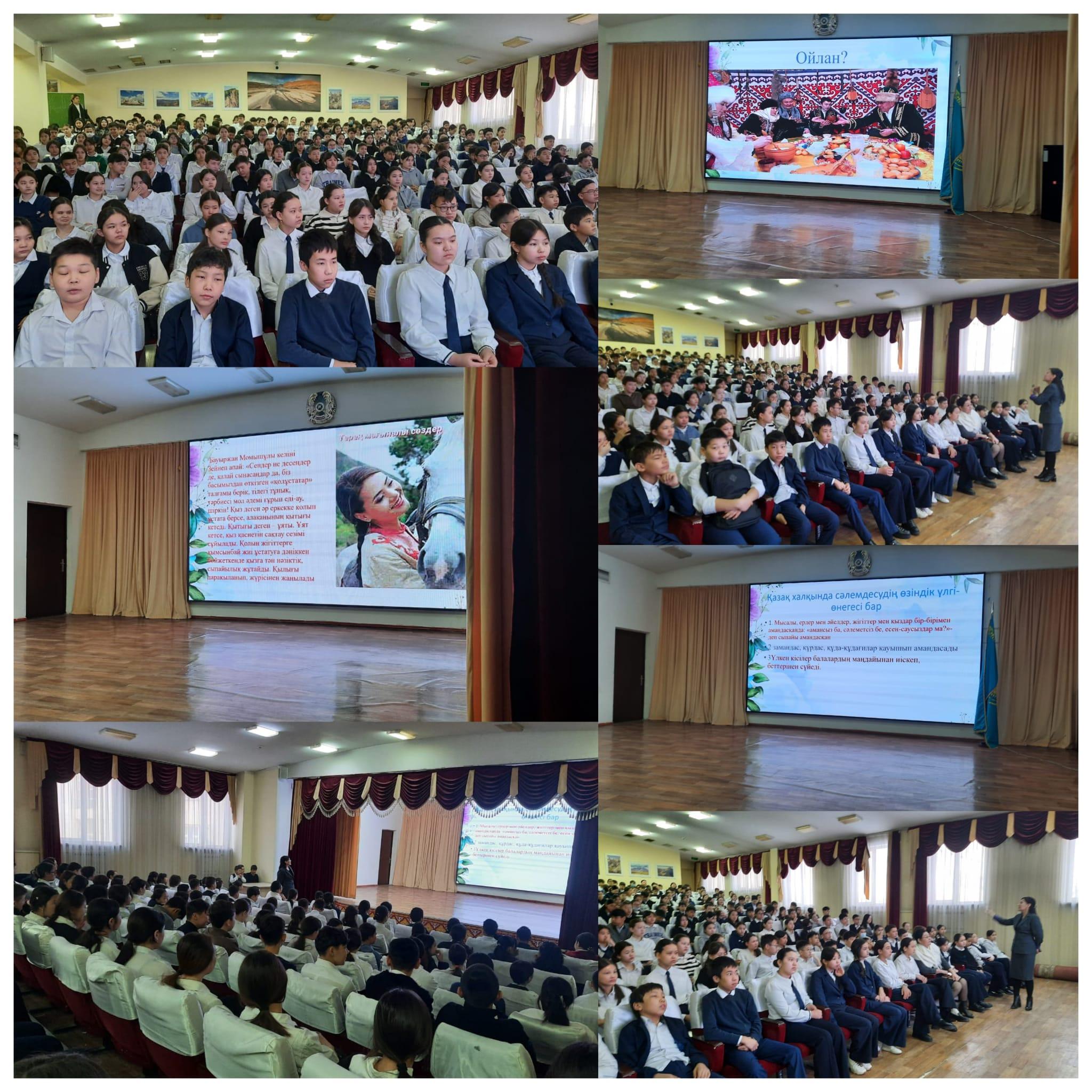 "Біртұтас тәрбие" бағдарламасы жоспарына сәйкес ұлттық құндылықтарды ұлықтау мақсатында "Сәлем-сөздің анасы" тақырыбында 8 "Е" сынып жетекшісі Л.Алғазиева түсіндірме жұмысын жүргізді. Сәлемдесудің адамдар арасындағы қарым-қатынасты арттыруға негіз болатындығы, оның түрлері мен мән-мағынасына түсінік берілді. Түсіндірме жұмысына 7-8 сынып оқушылары қатысты.
