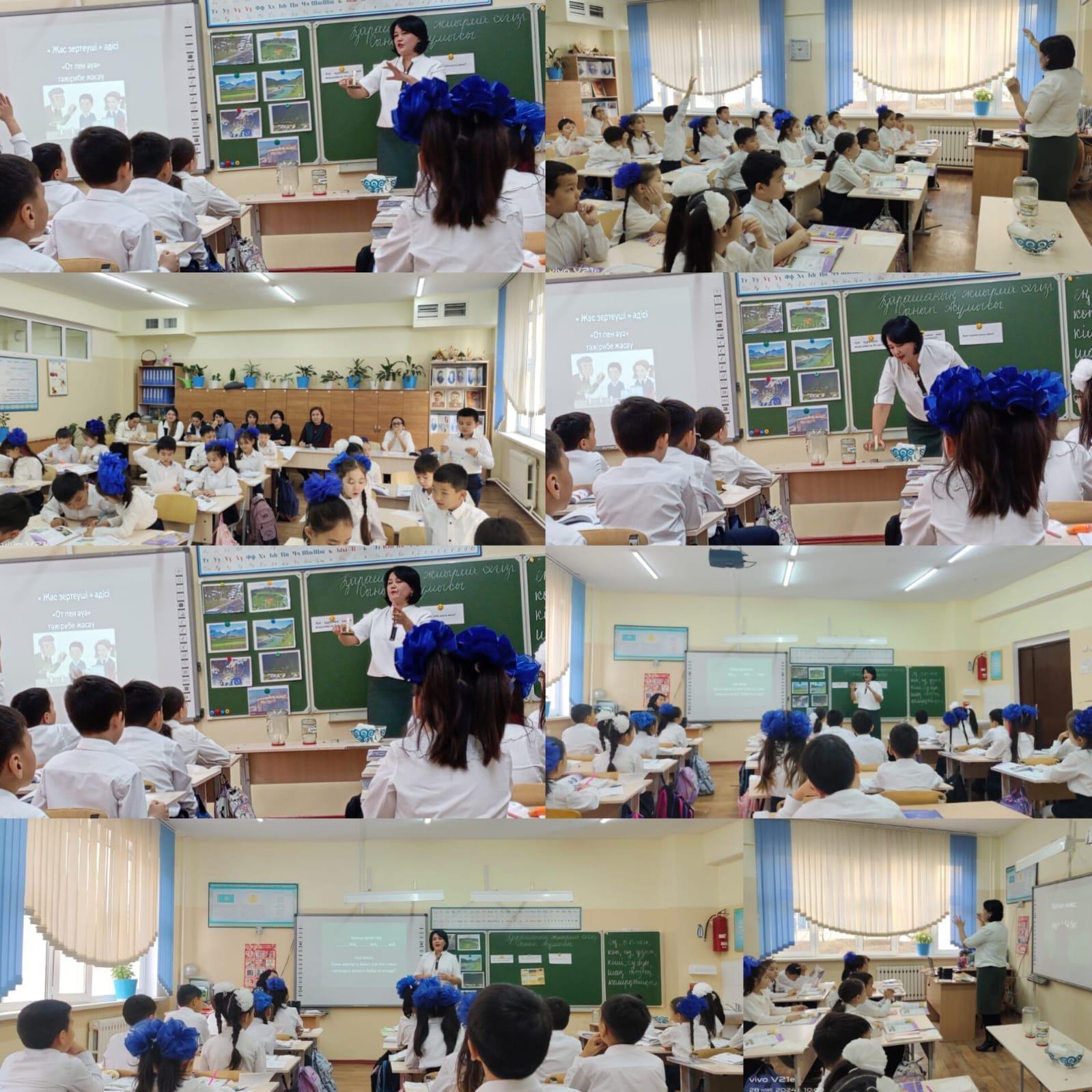 28.11.2024ж. күні мектеп-гимназиямызда "Тұлға қалыптастыруда ұлттық құндылықтар негізінде білім мен тәрбие беру" тақырыбындағы бастауыш сынып бірлестігінің онкүндігі аясында бастауыш сынып мұғалімі Жиянбаева Алмагул Турсинбековна 3 "В" сыныбына жаратылыстану пәнінен "Ауа неден құралады?"тақырыбында ашық сабақ өтті.
