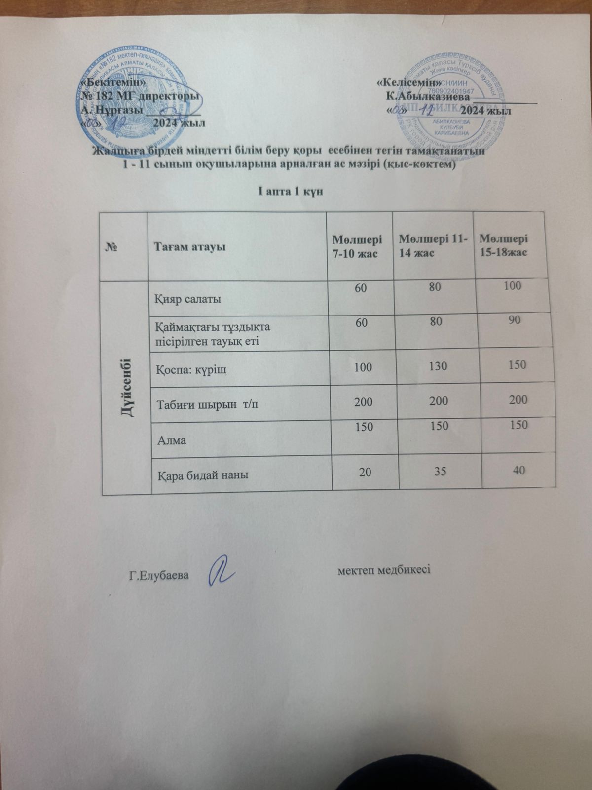 » Ас мәзірі 1 апта 1 күн