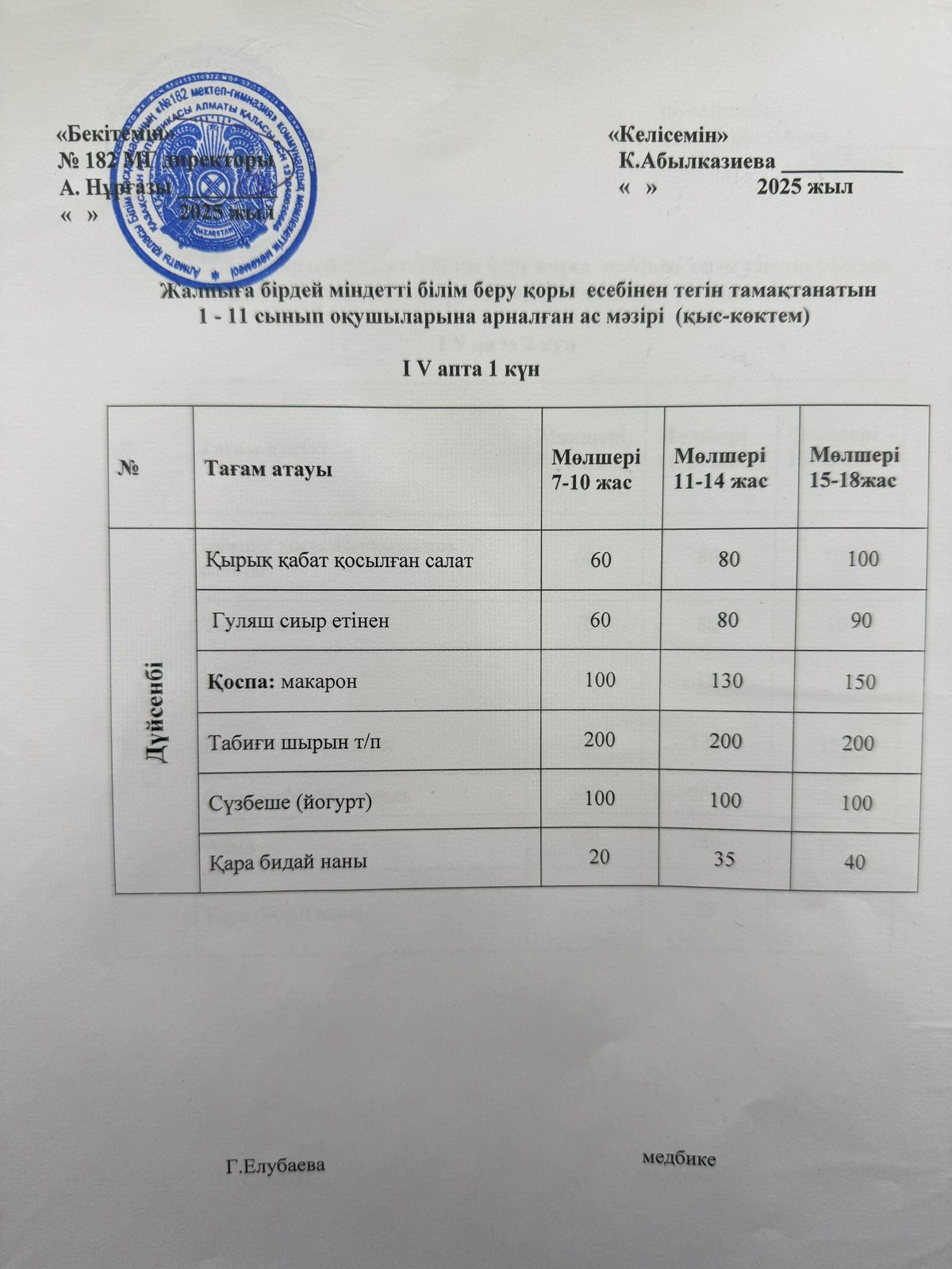 » Ас мәзірі 4 апта 1 күн