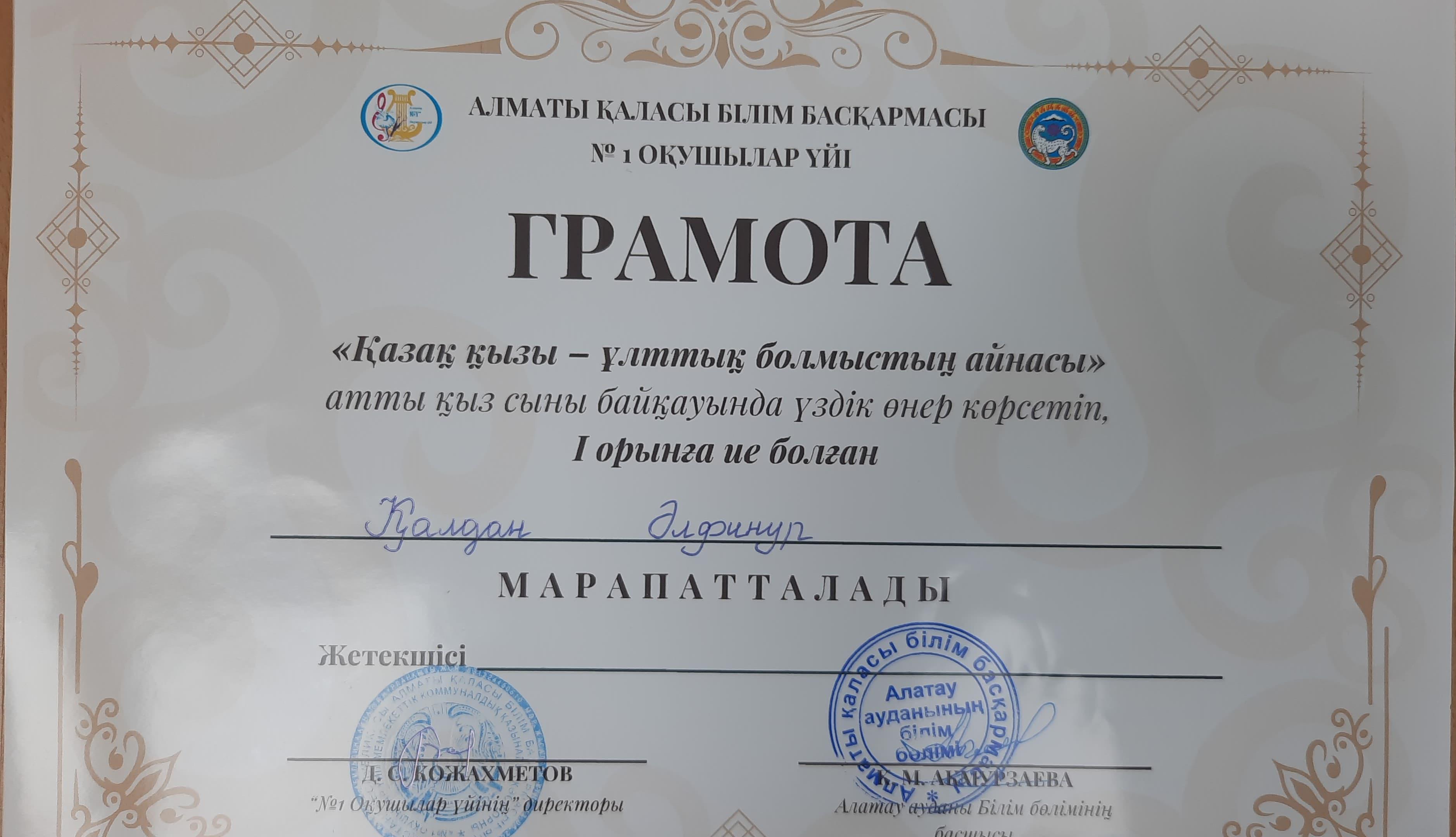 ОҚУШЫЛАРЫМЫЗДЫҢ ЖЕТІСТІКТЕРІ Мектеп-гимназиямыздың 7-сынып оқушысы Қалдан Әлфинур аудандық "Қазақ қызы-ұлттық болмыстың айнасы" атты қыз сыны байқауында үздік өнер көрсетіп, І орынға ие болды. Құттықтаймыз! 💐💐💐