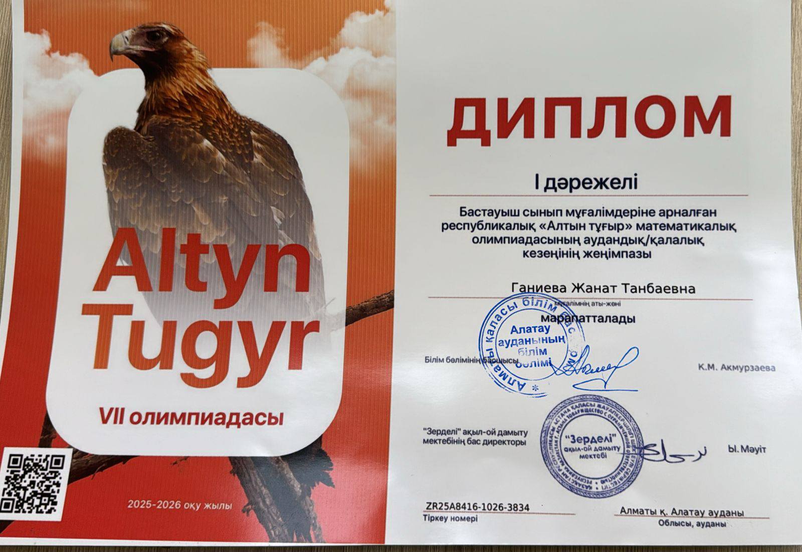 Бастауыш сынып мұғалімдеріне арналған республикалық "Алтын тұғыр" математикалық олимпиадасының аудандық кезеңінде ДОІЖО Ганиева Жанат Танбаевна кәсіби шеберлігінің нәтижесінде І дәрежелі дипломға ие болып, қалалық кезеңге жолдама алды. Құттықтаймыз! Байқаудың қалалық кезеңінде сәттілік тілейміз!