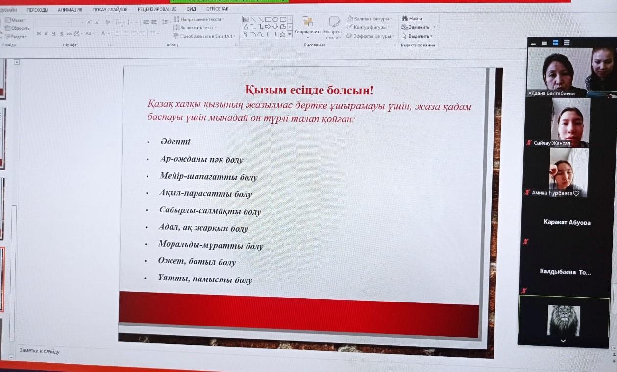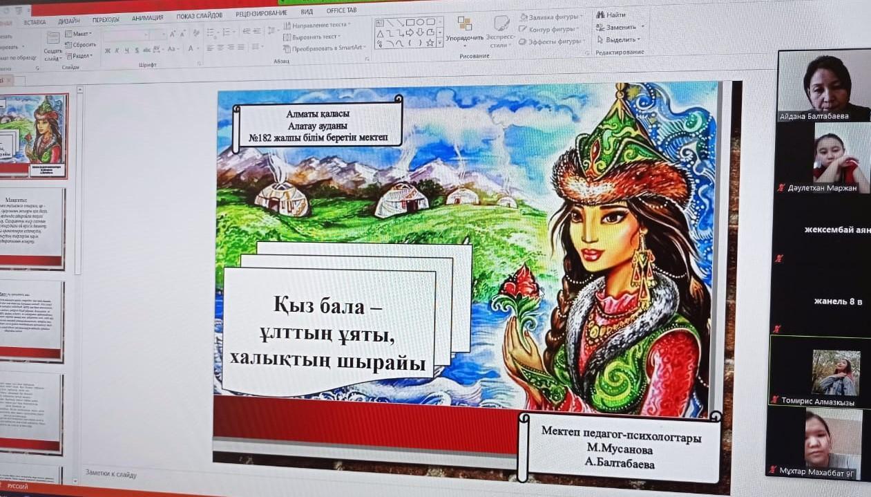 21.12.2020ж. күні мектебіміздің педагог-психологтары М.Мусанова мен А.Балтабаева 8-9 сыныптың қыздарына "Қыз бала - ұлттың ұяты, халықтың шырайы" тақырыбында Зум платформасы арқылы жиналыс өткізді. Мақсаты Қазақ қызының бойындағы ұлттық дәстүрімізге сай әдептілік, көріктілік, ептілік, инабаттылық, кішіпейілділік, сұлулық т.б. жан-жақты ұлттық қасиеттерін таныта білу;