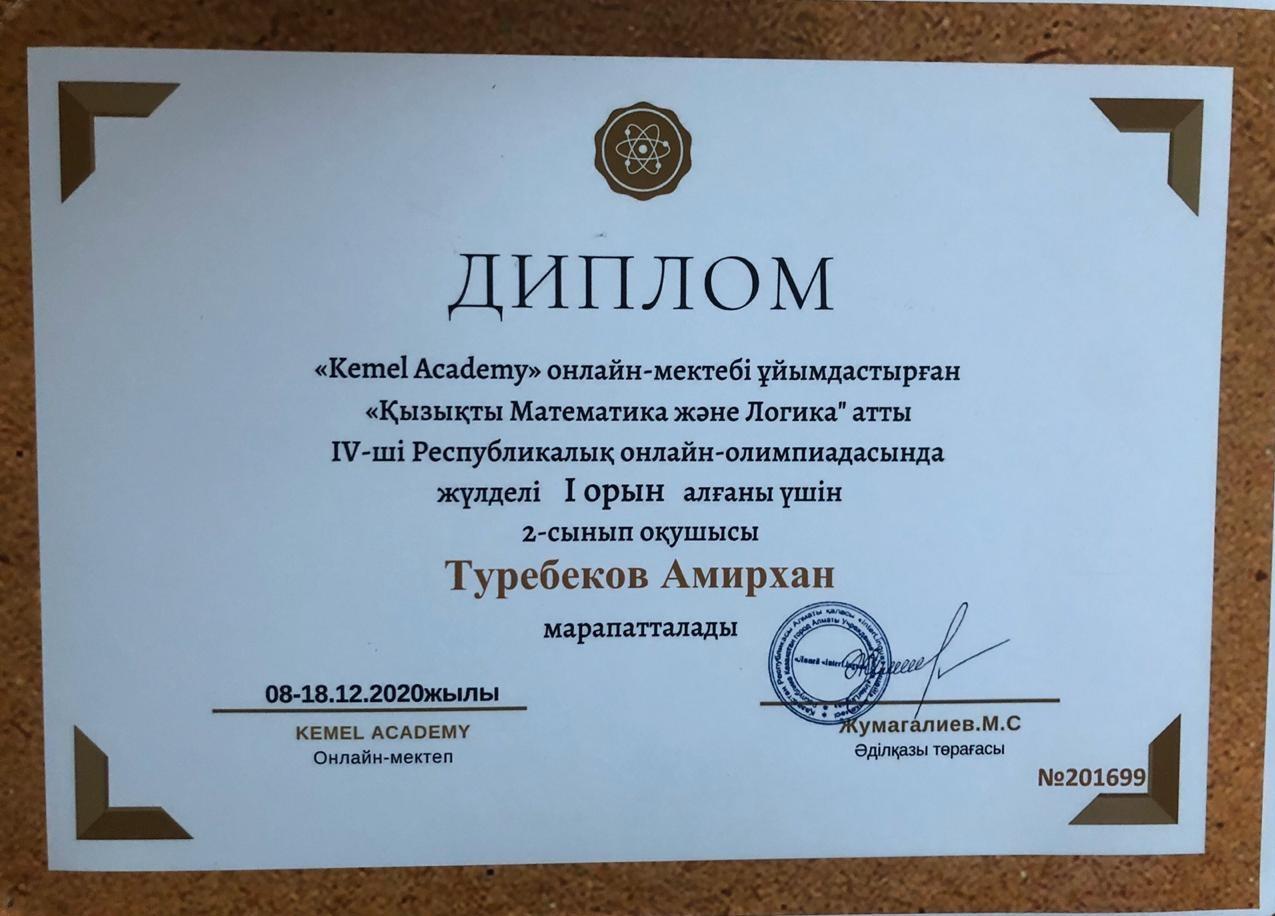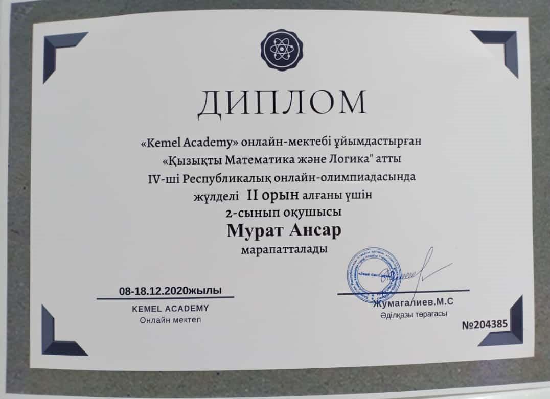 23 желтоқсан 2020 0 1 2 3 4 5 Оқушыларымыздың жетістіктері ОҚУШЫЛАРЫМЫЗДЫҢ ЖЕТІСТІКТЕРІМектебіміздің бастауыш сынып оқушылары "Kemel Academy" ұйымдастырған "Қызықты Математика дәне Логика" атты IV Республикалық онлайн-олимпиадасының жеңімпаздары атанды. Құттықтаймыз! Оқуда озат, зерек болыңыздар! Осы беттің QR-коды:QR-код этой страницы: