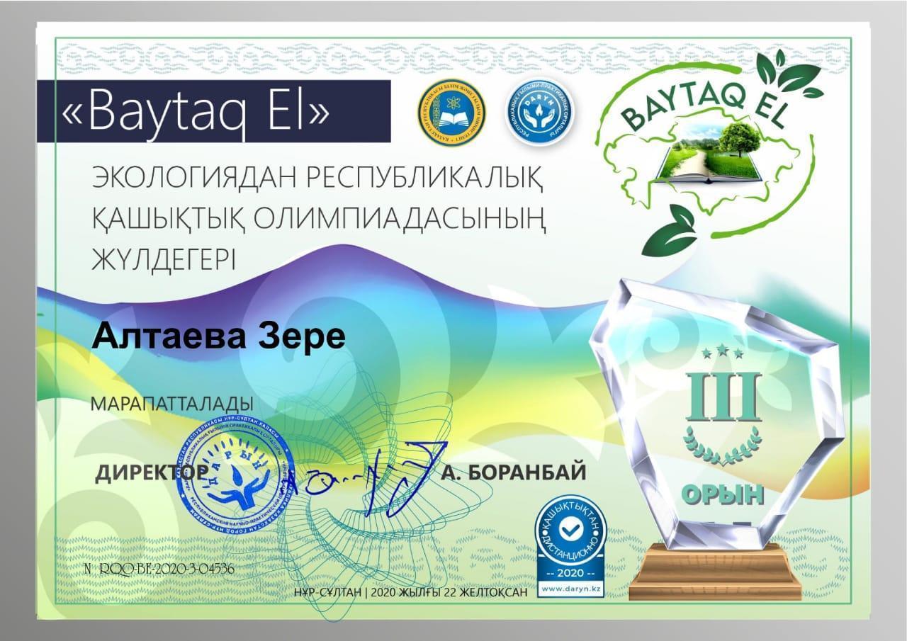 Мектебіміздің оқушылары Алтаева Зере мен Тоқтасын Нұржас "Baytaq El" экологиядан республикалық олимпиадасына қатысып, ІІІ орынға ие болды. Құттықтаймыз!