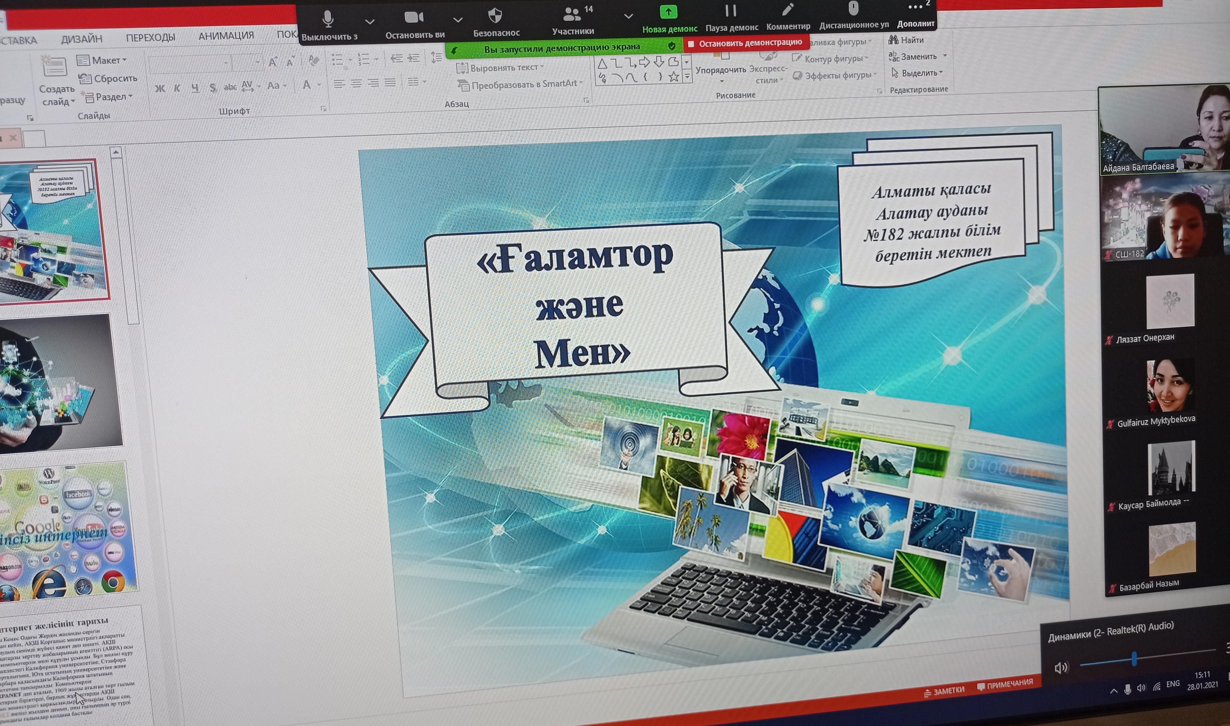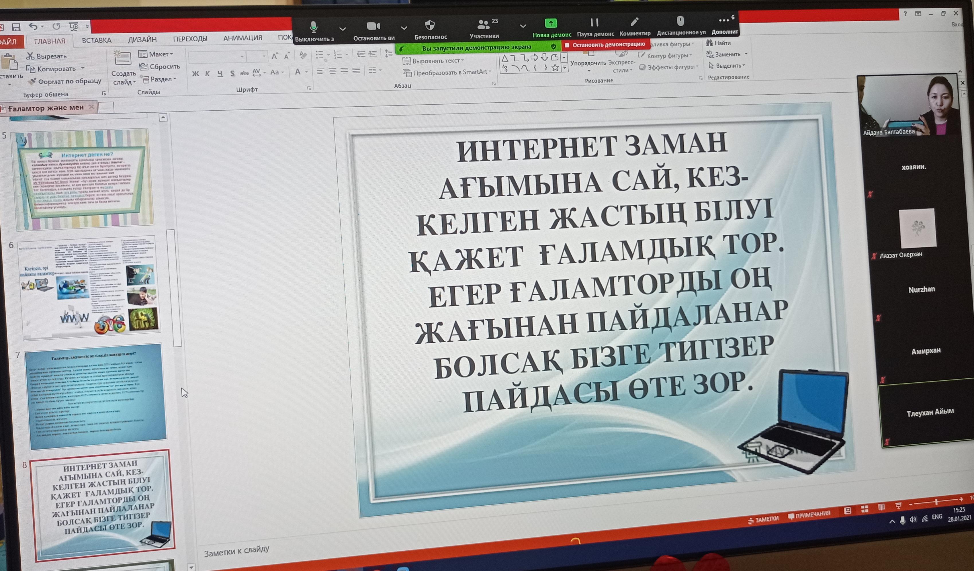 28.01.2021ж. күні мектебімізде мектеп педагог-психологтары М.Мусанова мен А.Балтабаева, аға тәлімгер А.Дүйсебек 8-сынып оқушыларына "Ғаламтор және Мен" тақырыбында ZOOM платформасы арқылы конференция өткізді. Конференция барысында ғаламторға тәуелділік, ғаламтордың пайдалы және зиянды жағы туралы айтылып, оқушылардың пікірлері тыңдалды, ұсыныстар мен кеңестер айтылды.