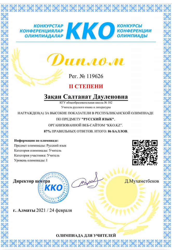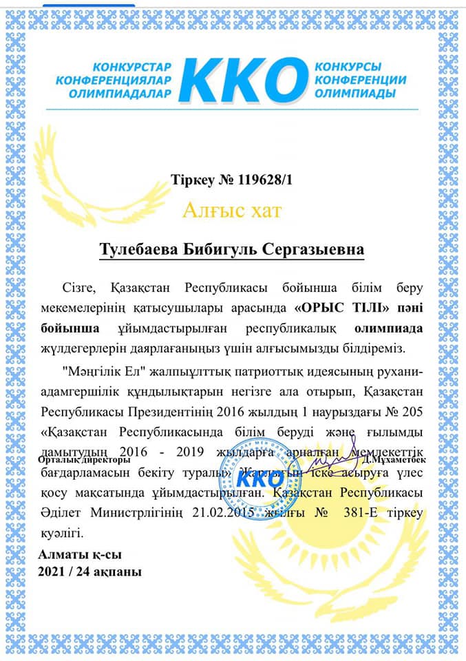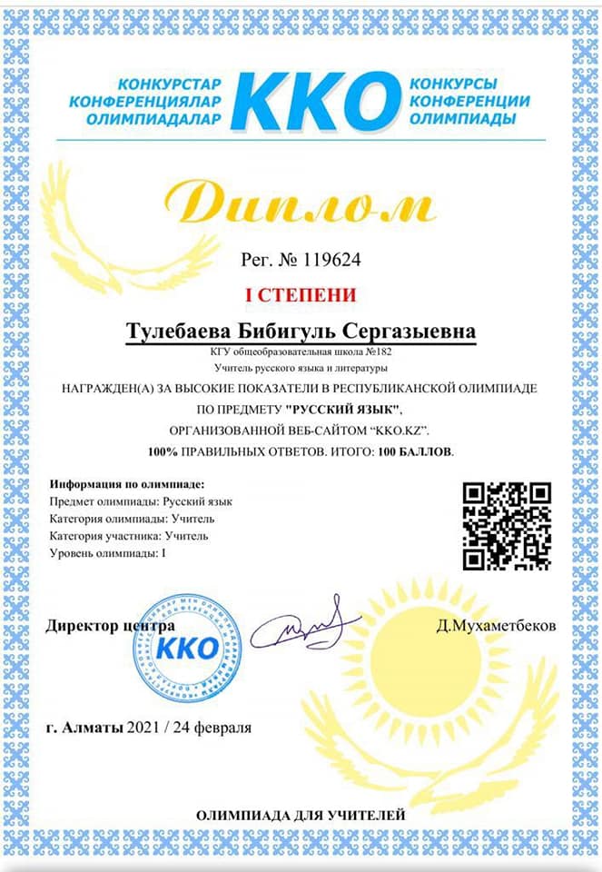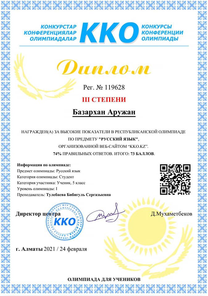 Мектебіздің орыс тілі пәнінің мұғалімдері Б.С.Тулебаева мен С.Д.Закан мұғалімдер арасындағы орыс тілі пәнінен республикалық олимпиадаға қатысып, І,ІІ дәрежелі Дипломдармен марапатталды. Орыс тілі пәнінен оқушылар арасындағы республикалық олимпиададан 5-сынып оқушысы Базархан Аружан ІІІ дәрежелі Дипломмен марапатталды. Құттықтаймыз!