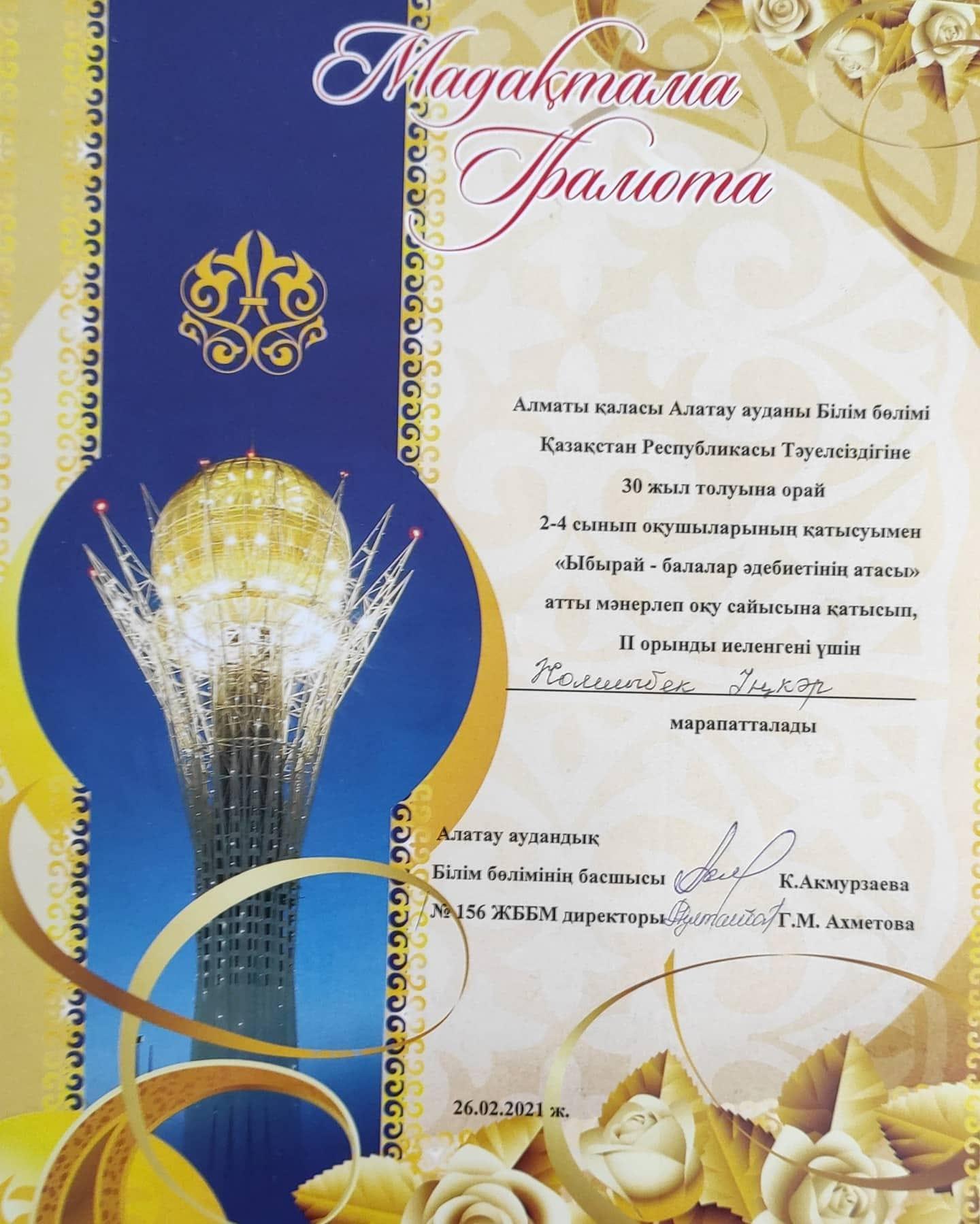 Мектебіміздің 2 "З" сынып оқушысы Жолшыбек Іңкәр Қазақстан Республикасы Тәуелсіздігінің 30 жылдығына орай 2-4 сынып оқушылары арасында ұйымдастылған "Ыбырай - балалар әдебиетінің атасы" атты аудандық мәнерлеп оқу сайысына қатысып, 2-орынға ие болды. Жетекшісі бастауыш сынып мұғалімі Е.Э.Хужабаева. Құттықтаймыз! Талабыңызға нұр жаусын!