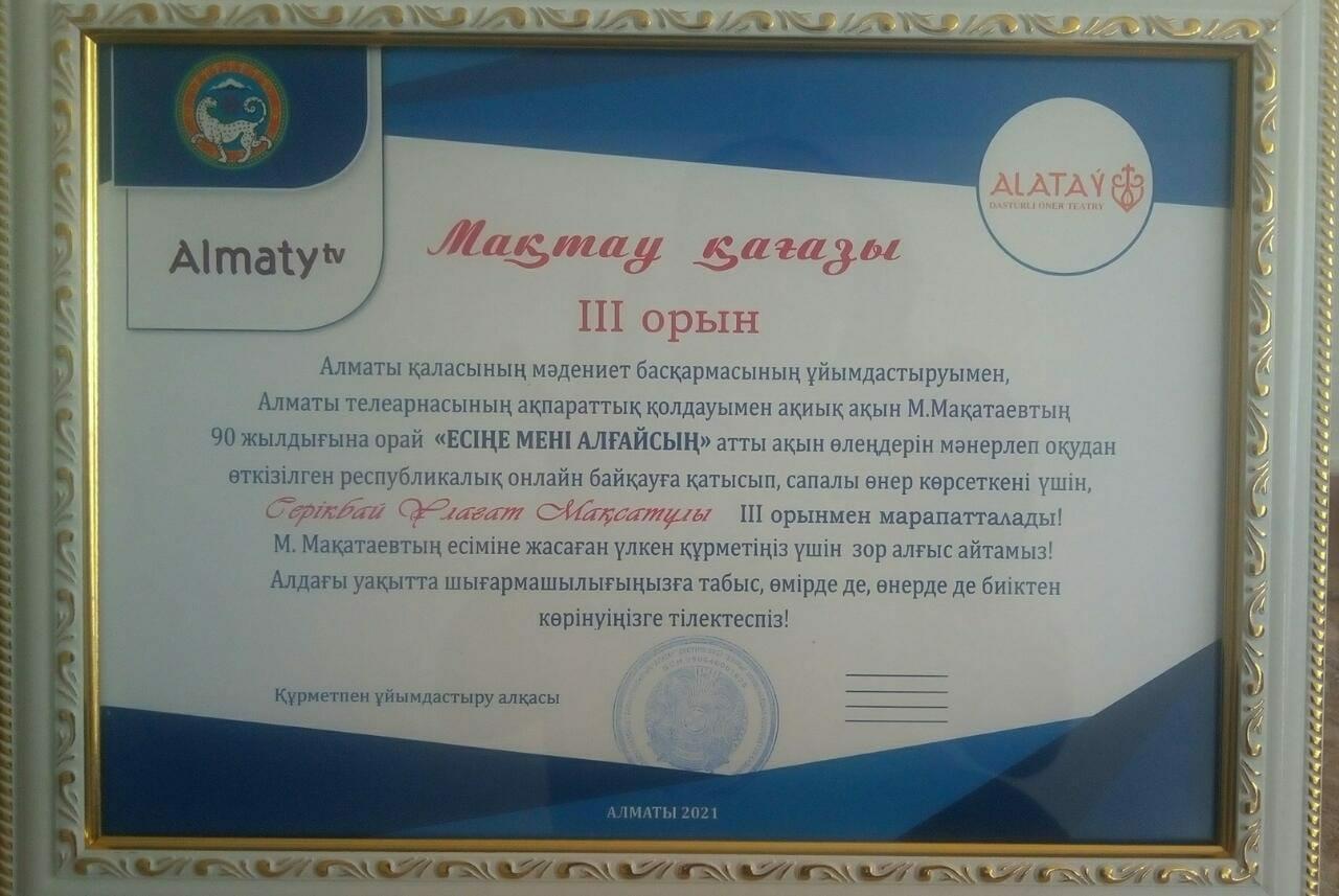 Алматы қаласы мәдениет басқармасының ұйымдастыруымен, Алматы телеарнасының ақпараттық қолдауымен ақиық ақын М.Мақатаевтың 90 жылдығына орай "ЕСІҢЕ МЕНІ АЛҒАЙСЫҢ" атты ақын өлеңдерін мәнерлеп оқудан өткізілген онлайн байқауға қатысып, сапалы өнер көрсеткені үшін мектебіміздің бастауыш сынып оқушысы Серікбай Ұлағат Мақсатұлы 3-орынға ие болып, Дипломмен марапатталды. Құттықтаймыз! Талабыңызға нұр жаусын!