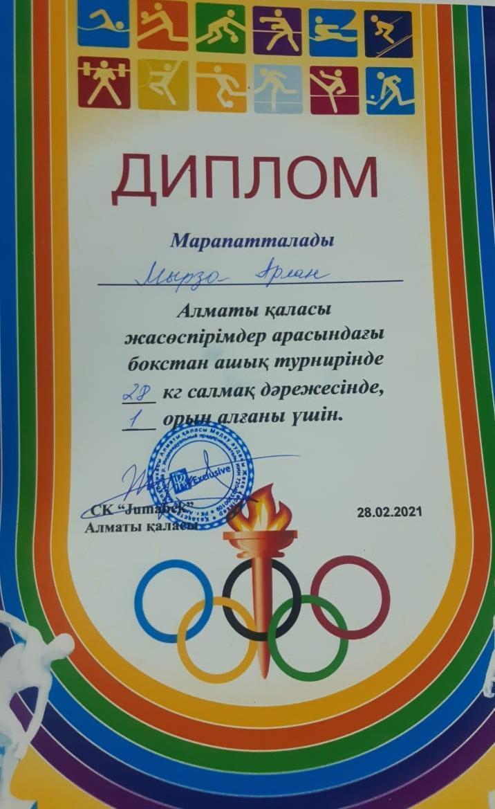 Мектебіміздің бастауыш сынып оқушысы Мырза Арлан Алматы қаласы жасөспірімдер арасындағы бокстан ашық турнирінде 28 кг салмақ дәрежесінде І орынға ие болып, Дипломмен марапатталды. Құттықтаймыз! Жарайсың! Біздің болашақ чемпионымыз!