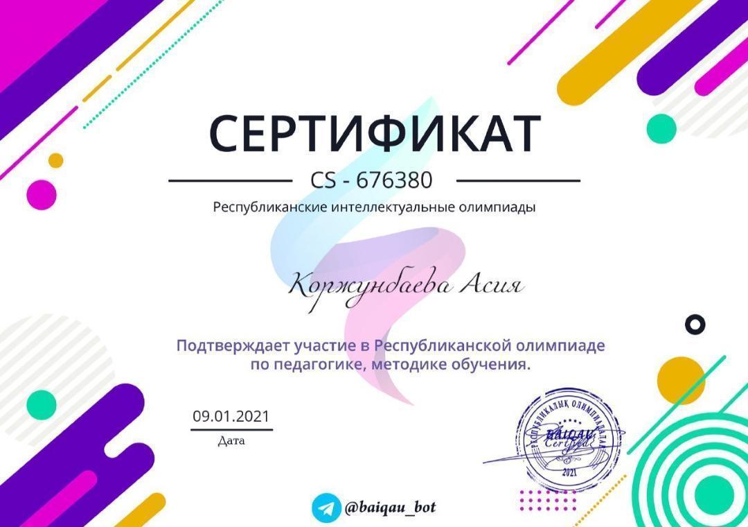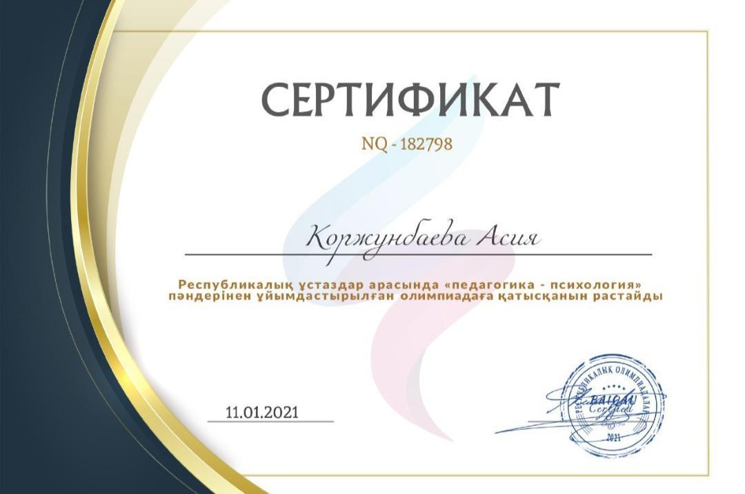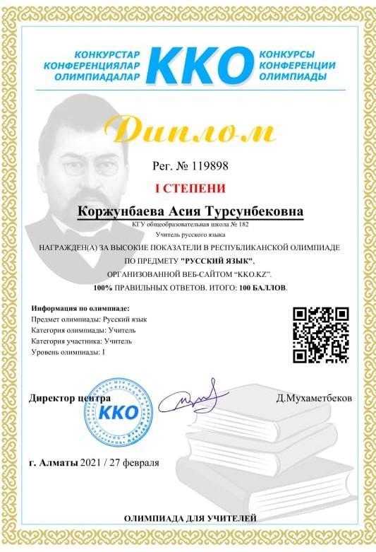 27 ақпан 2021 0 1 2 3 4 5 Мұғалімдеріміздің жетістіктері МҰҒАЛІМДЕРІМІЗДІҢ ЖЕТІСТІКТЕРІМектебіміздің орыс тілі мен әдебиеті пәні мұғалімі Коржунбаева Асия Турсынбековнаның республикалық олимпиадалар бойынша диплом, сертификаттары. Құттықтаймыз! Әрқашан еңбегіңіз жеңісті, жемісті болсын! Осы беттің QR-коды:QR-код этой страницы: