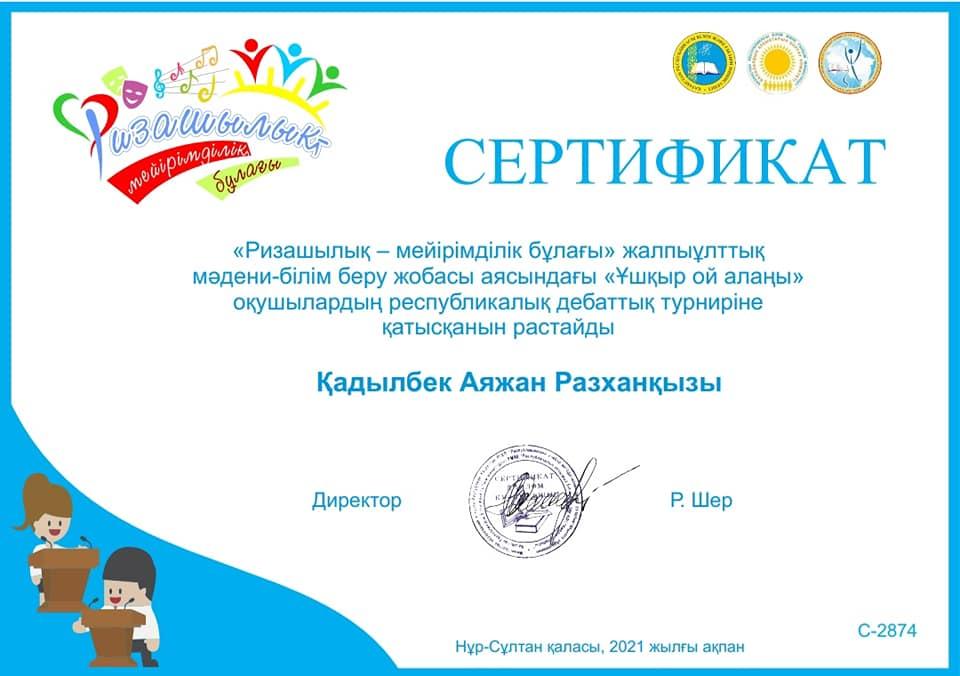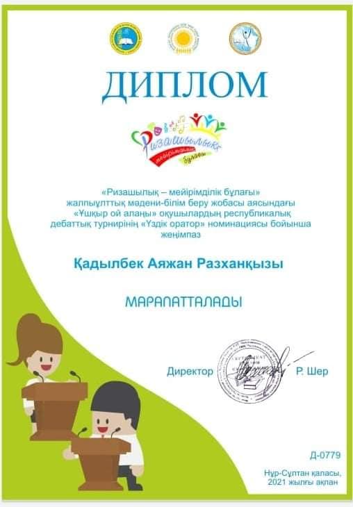 Республикалық "Ұшқыр ой алаңы" дебат турнирінде оқушысы Қадылбек Аяжан «Үздік оратор» номинациясымен марапатталды