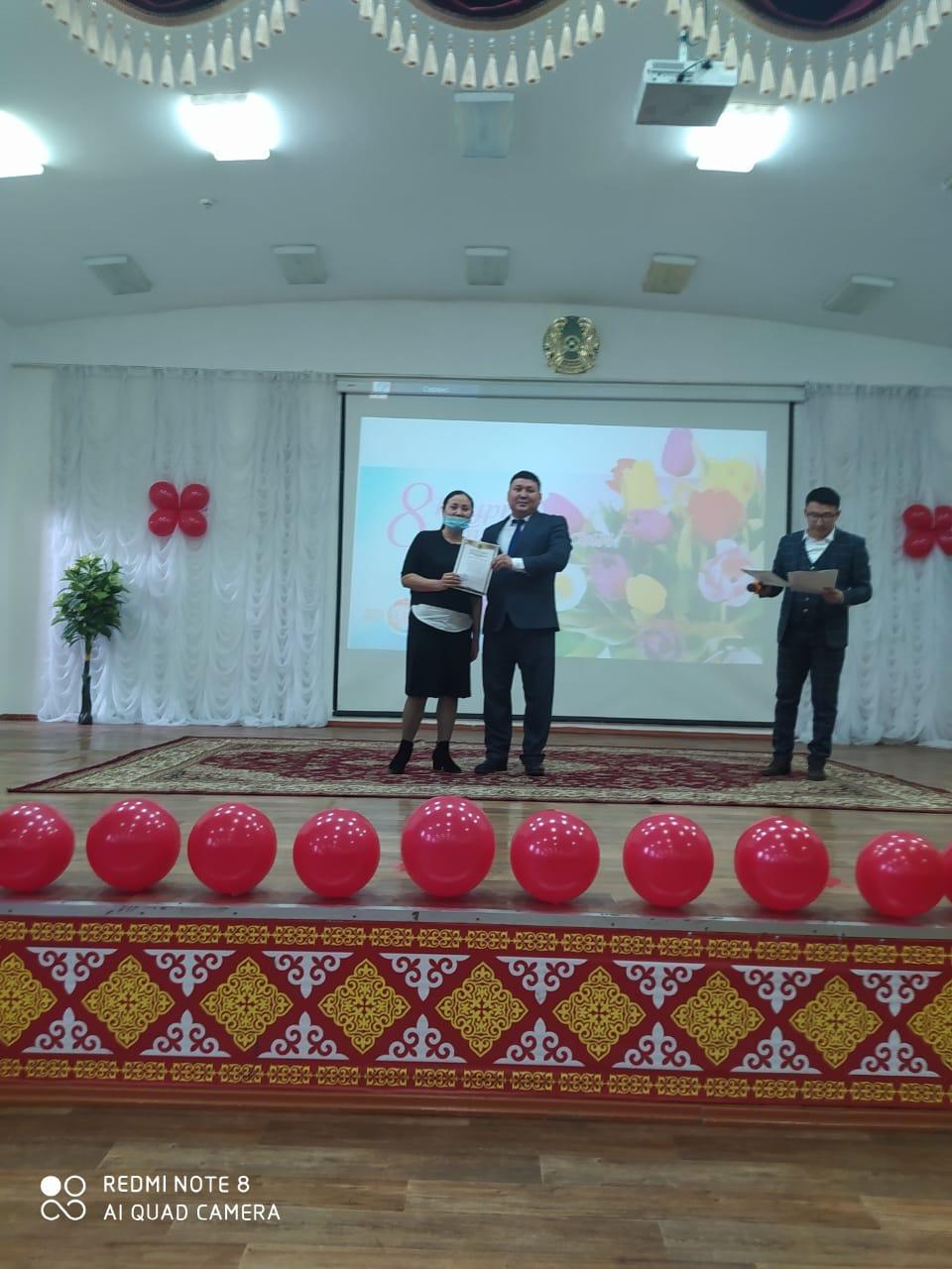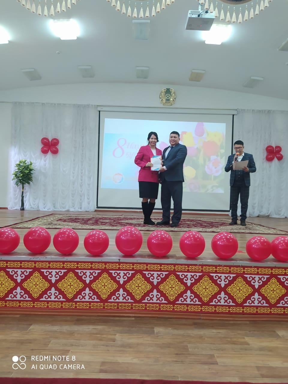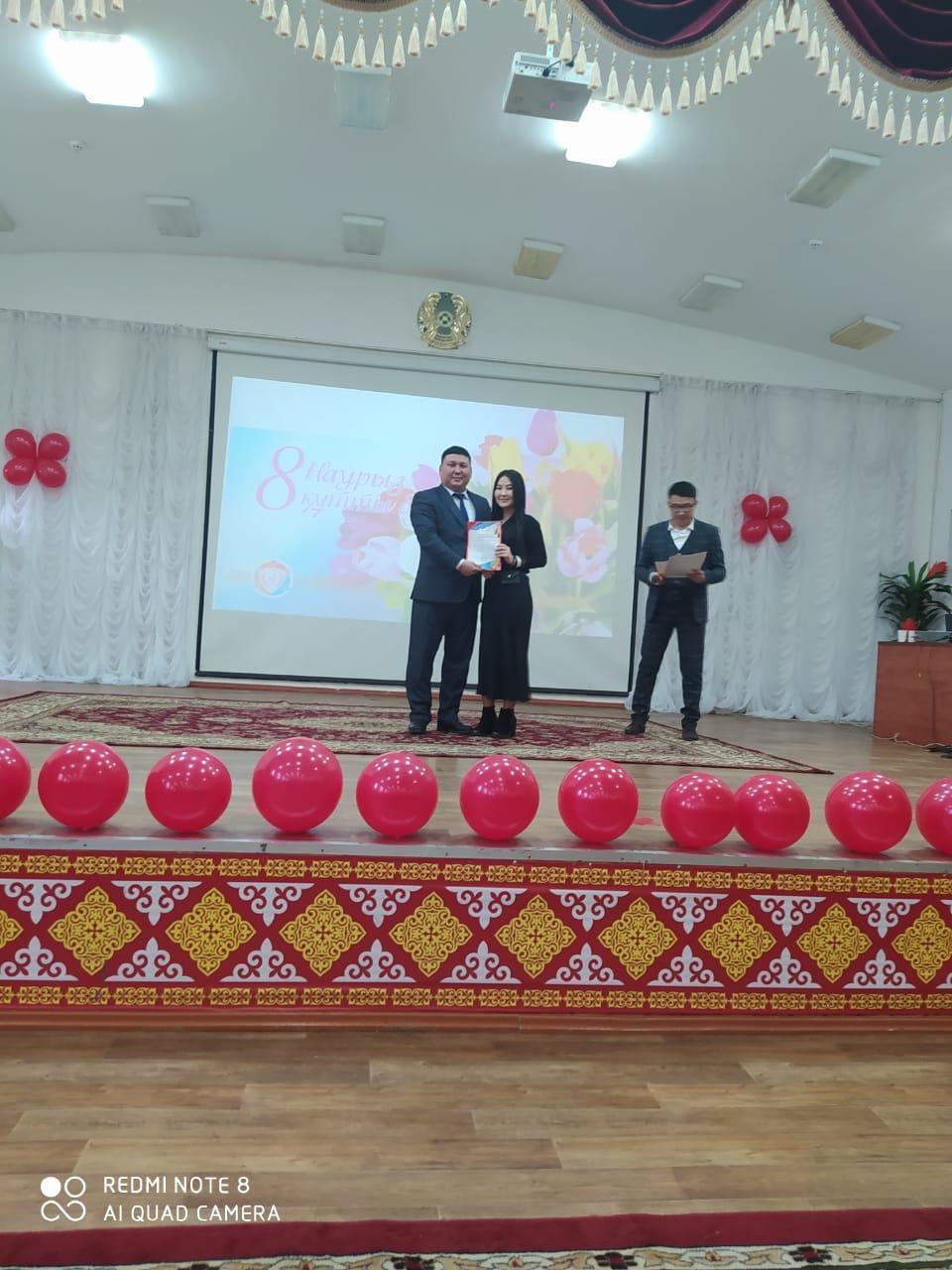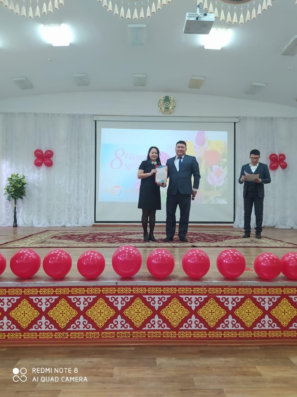 Көктемнің алғашқы мерекесі – 8-наурыз Халықаралық әйелдер, қыз-келіншектер мерекесі қарсаңында өткен мерекелік іс-шарада мектебіміз директоры А.Нұрғазы мырза мектебіміз мұғалімдерін "Nur Otan" партиясы Алатау аудандық филиалы төрағасының бірінші орынбасары Ж.Алдамбергенованың, Алатау аудандық Білім бөлімі басшысы К.М.Акмурзаеваның және мектепішілік Алғыс хаттармен марапаттады.